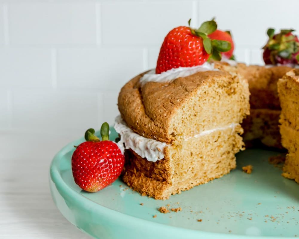 Airy, sponge-like, and just the right amount of sweet, this almond-infused angel food cake is a lightened-up take on a timeless classic. Made with egg whites and gluten-free flour, it skips the sugar overload without sacrificing texture or flavour. Garnished with whipped coconut cream and fresh strawberries, it’s the perfect end to a summer meal—elegant, nostalgic, and always a crowd-pleaser.