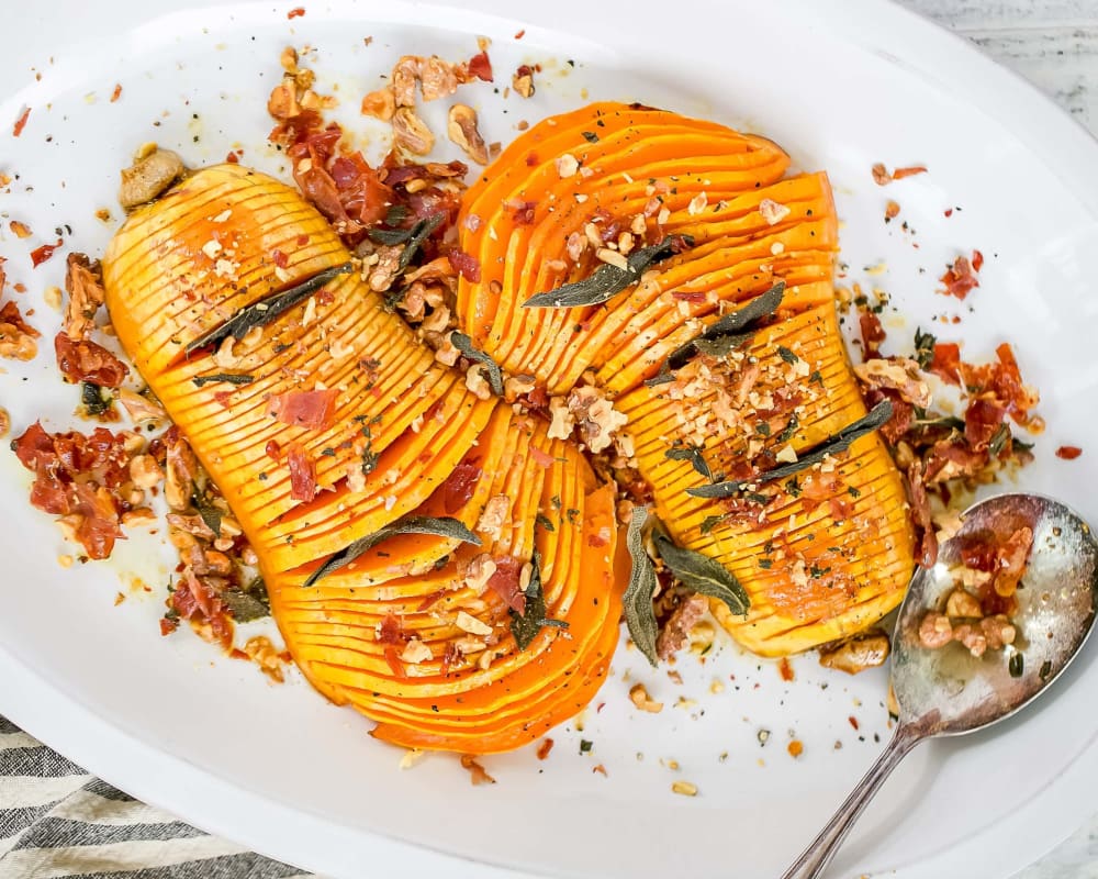 This elegant Hasselback Squash with Proscuitto is not only visually stunning but also packed with flavour. Thin slices of tender butternut squash are layered with crispy prosciutto, earthy sage, and crunchy walnuts for a delicious textural contrast. The drizzle of maple syrup adds a perfect touch of sweetness, complementing the rich, savoury elements. This gluten-free and grain-free dish is a perfect holiday centrepiece, rich in vitamins A and C, promoting eye health and immune support.