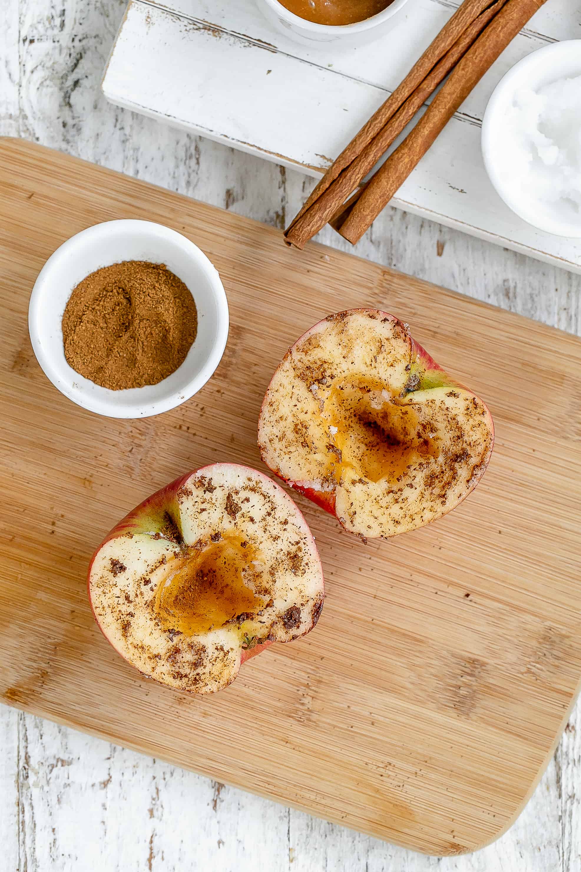 Rub ¼ tsp of the coconut oil over the cut side of the apple and sprinkle with a pinch of cinnamon. Place cut side down and bake for five minutes. Remove from the air fryer and flip the apples over. Bake for another four minutes.