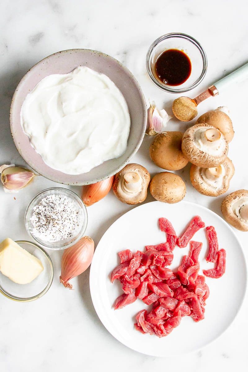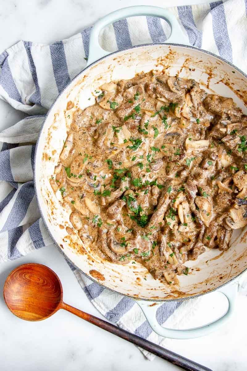 Garnish with the parsley, season with additional salt and pepper if desired, and enjoy! Typically beef stroganoff is served with egg noodles, but you can also just have it as is with your favourite sides.