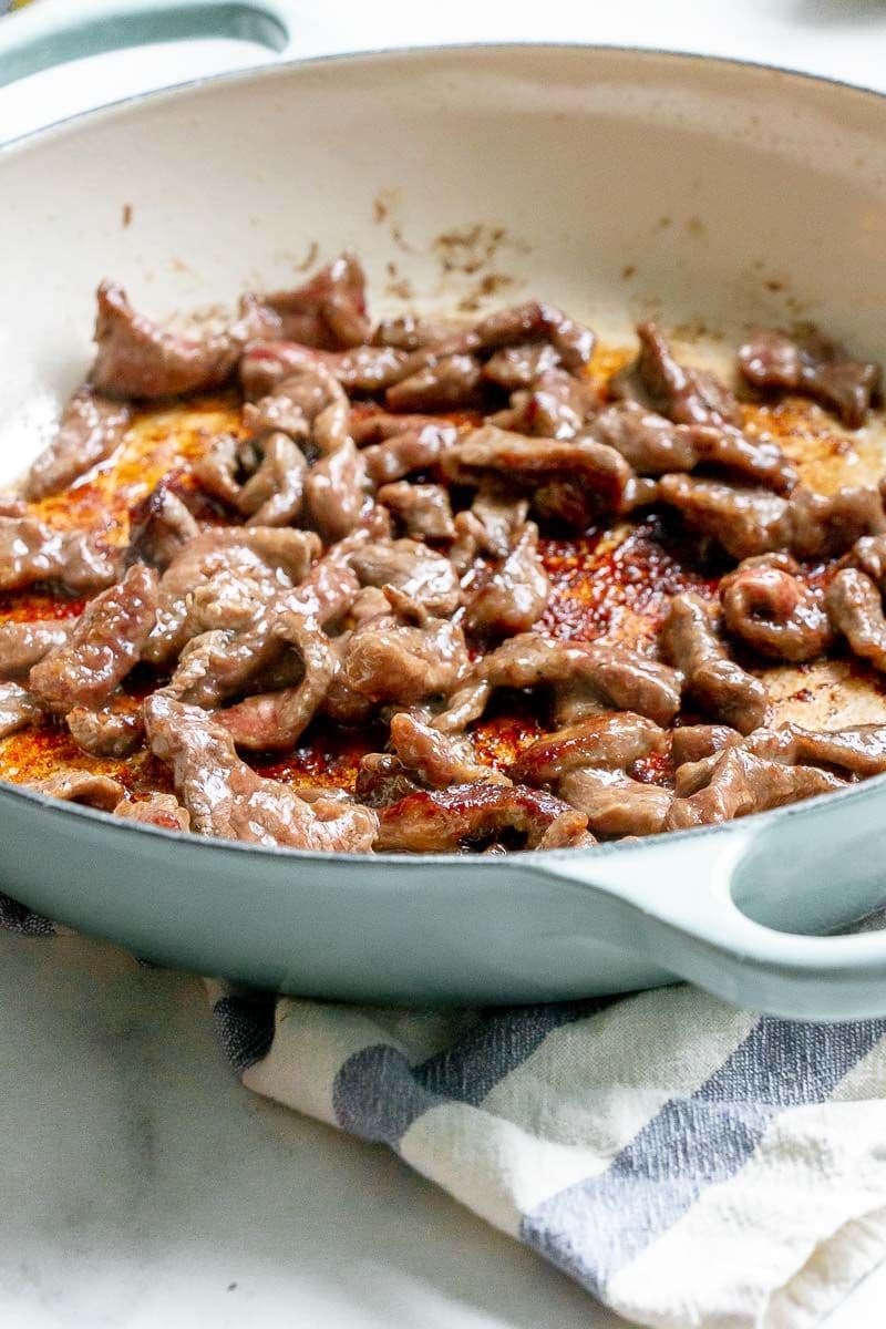 Reduce the heat to low, add Worcestershire sauce and Dijon mustard, and mix well. Add the steak back to the skillet and coat it in the mushroom mixture.