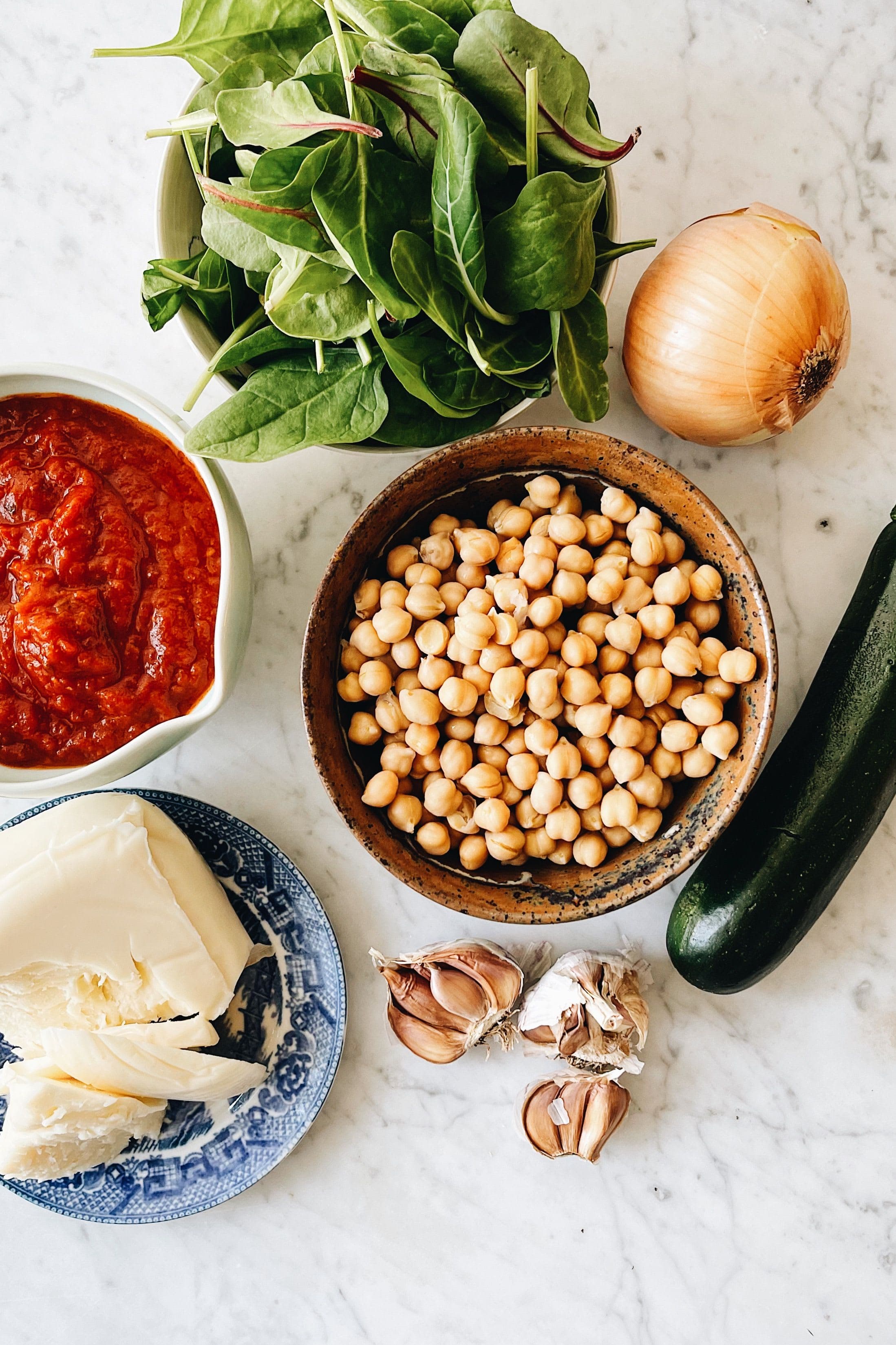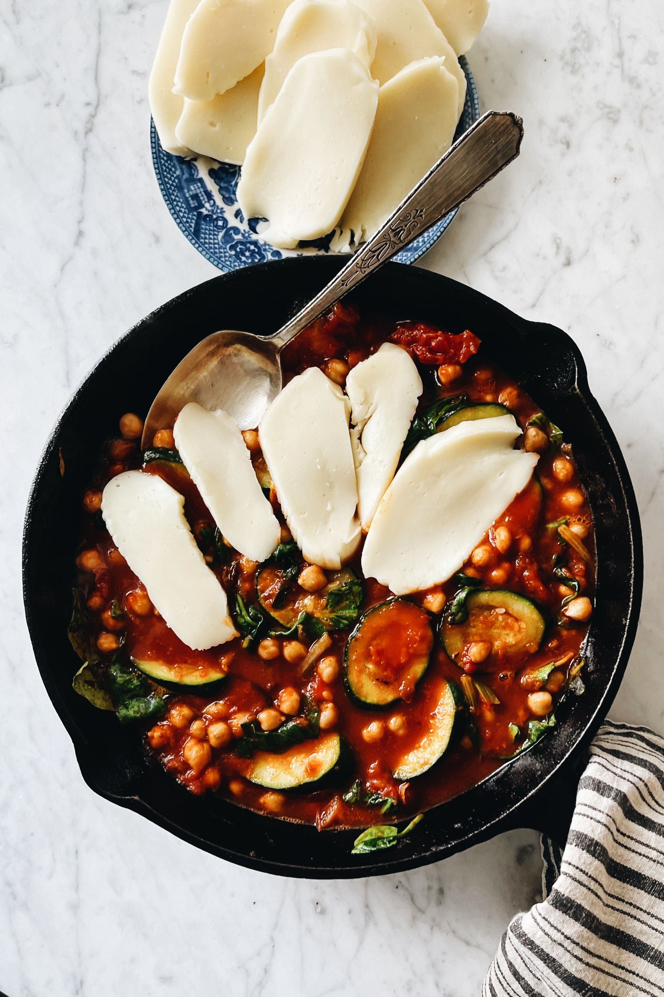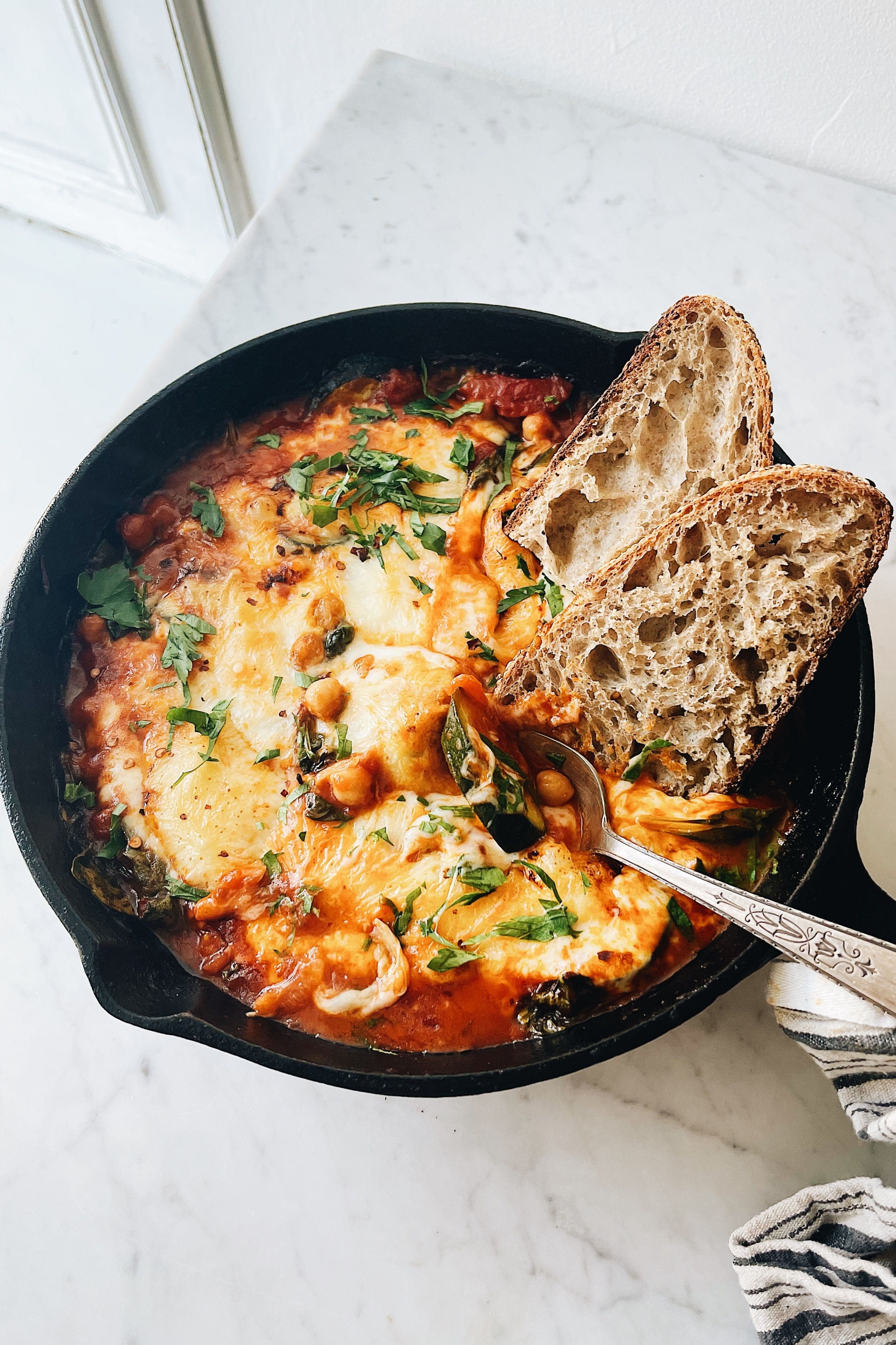 This rich flavourful, cheesy chickpea stew is a perfect way to use up leftover veggies and a few star pantry items. I love having jars of marinara and cans of beans ready to go for a perfect weeknight meal with protein, healthy fats and lots of fibre. This is a really simple play on a traditional Italian Parmesan-type dish with spinach, zucchini, chickpeas and so much gooey mozzarella! Baked to perfection, this dish works really well with a big salad and a hunk of your favourite bread, eaten straight from the pan!