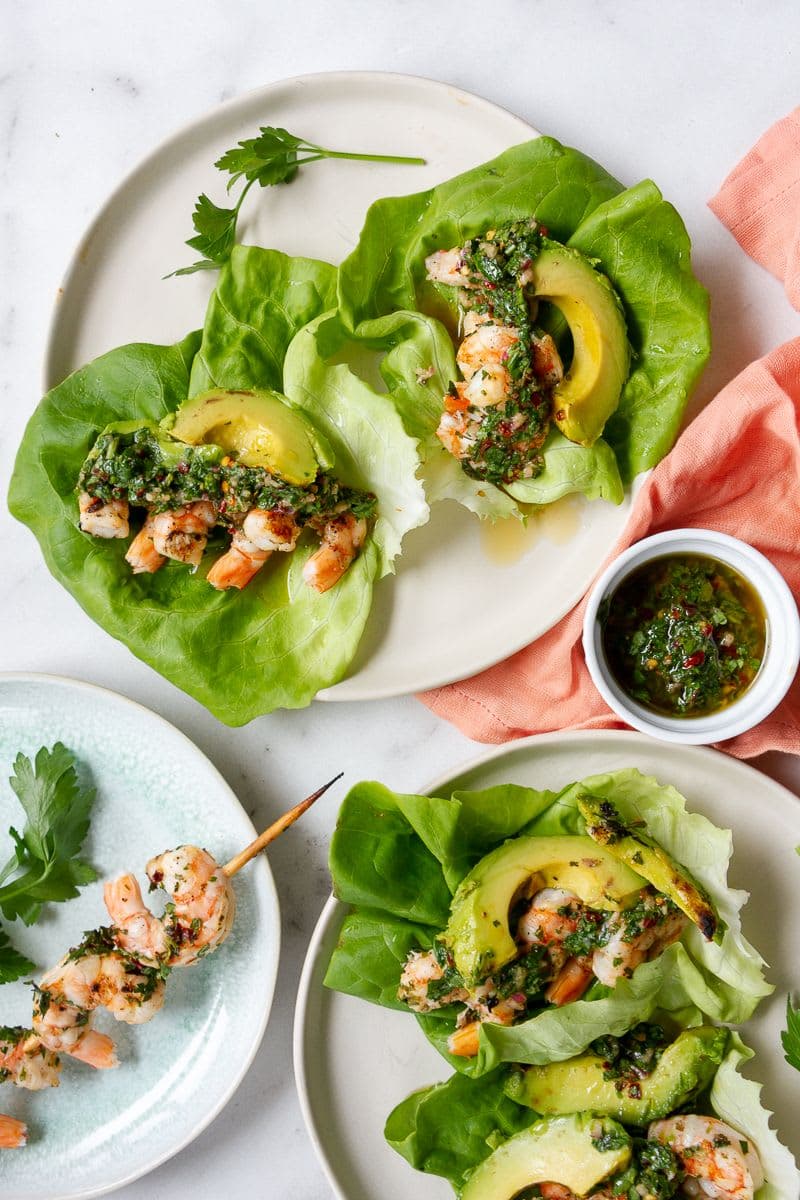 Grill the shrimp for three to four minutes on each side. If using, brush the avocado with some of the marinade and grill for five minutes. Take the shrimp off the skewers and place them on the lettuce leaves. Top with the leftover marinade and the grilled avocado. Enjoy!