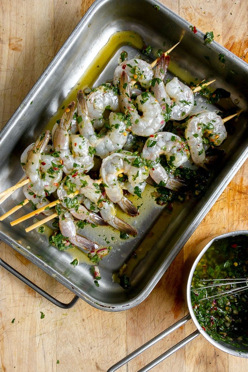 Put the shrimp on the skewers and marinate in the chimichurri for 15 minutes in the refrigerator. Set aside the unused marinade.