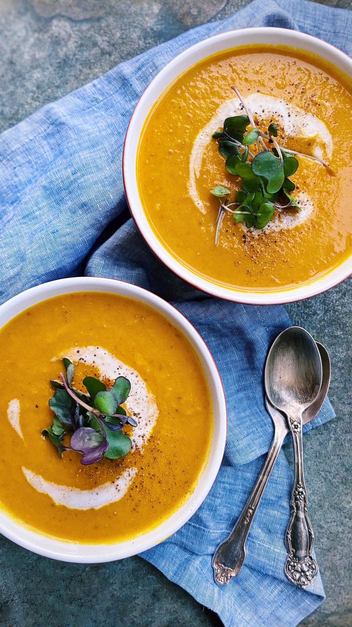 Let soup cool slightly, then purée in a blender until smooth. Add to bowls and garnish with pumpkin seeds salt and pepper