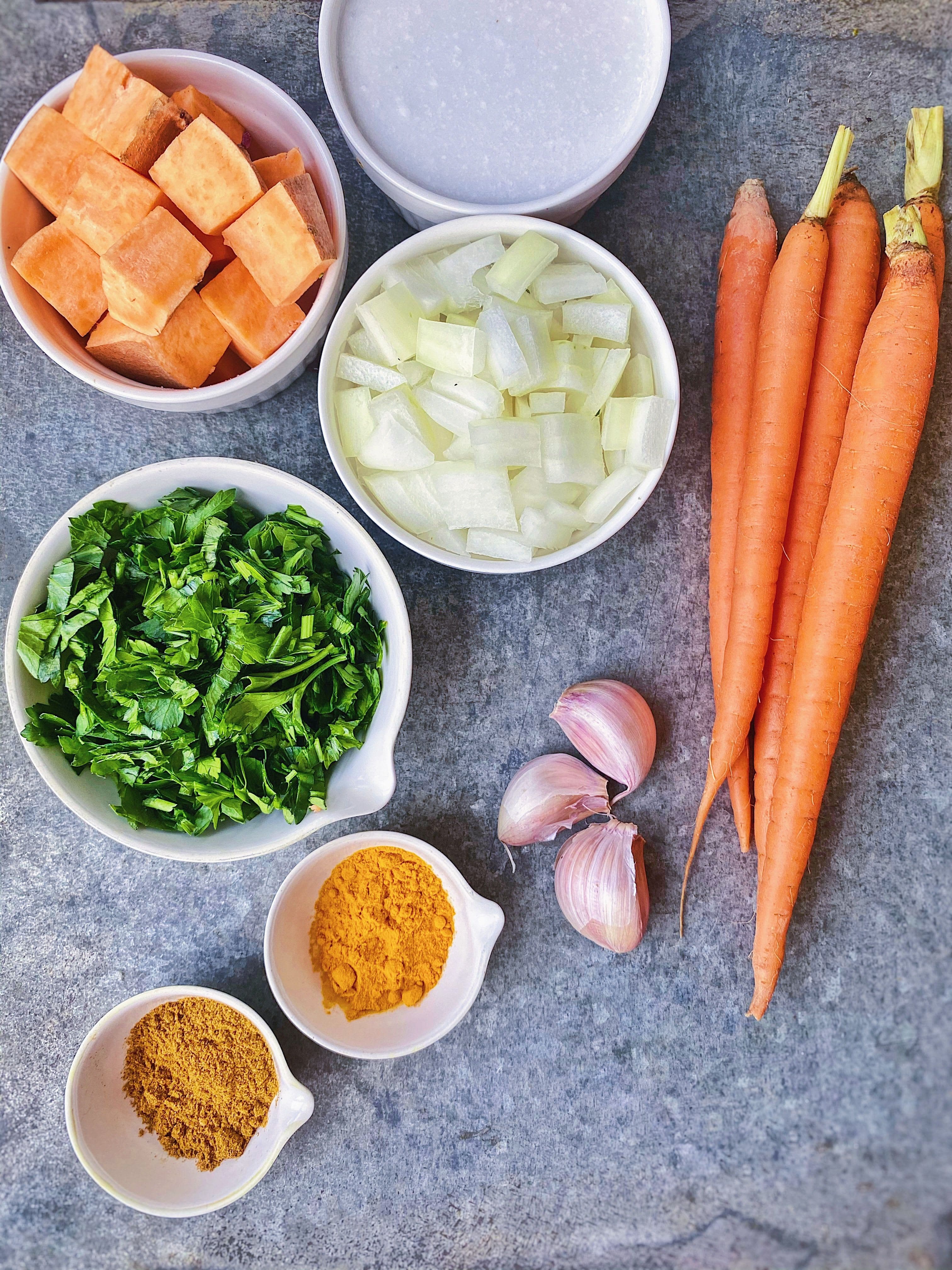 Heat the coconut oil in a large pot and add onion, garlic and celery. When onions have softened, Add the carrots, ginger and sweet potato keep stirring for 4 mins. Add spices and cook for another 2 mins.