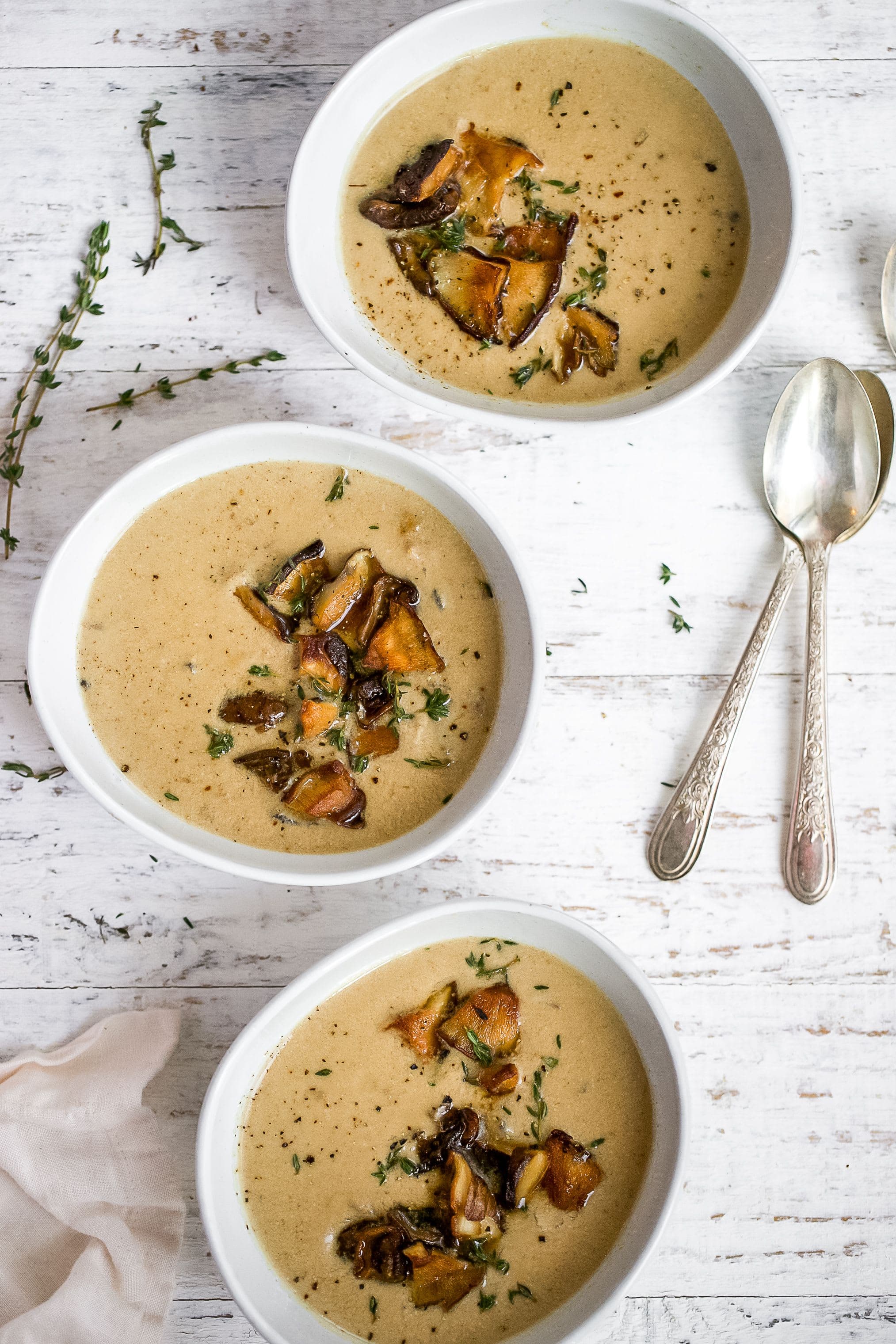 Divide into bowls, and top with the reserved browned mushrooms and thyme. Enjoy!