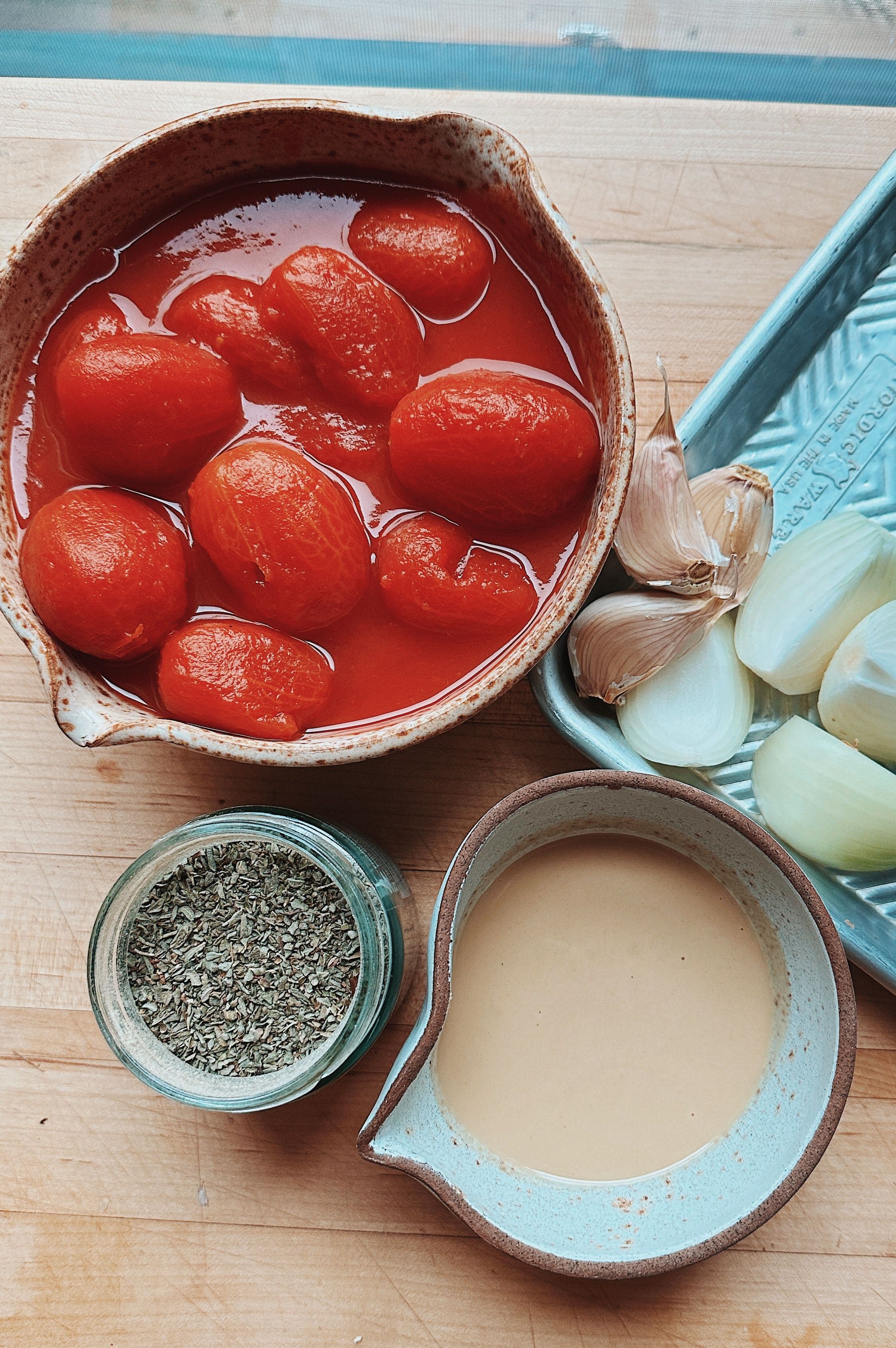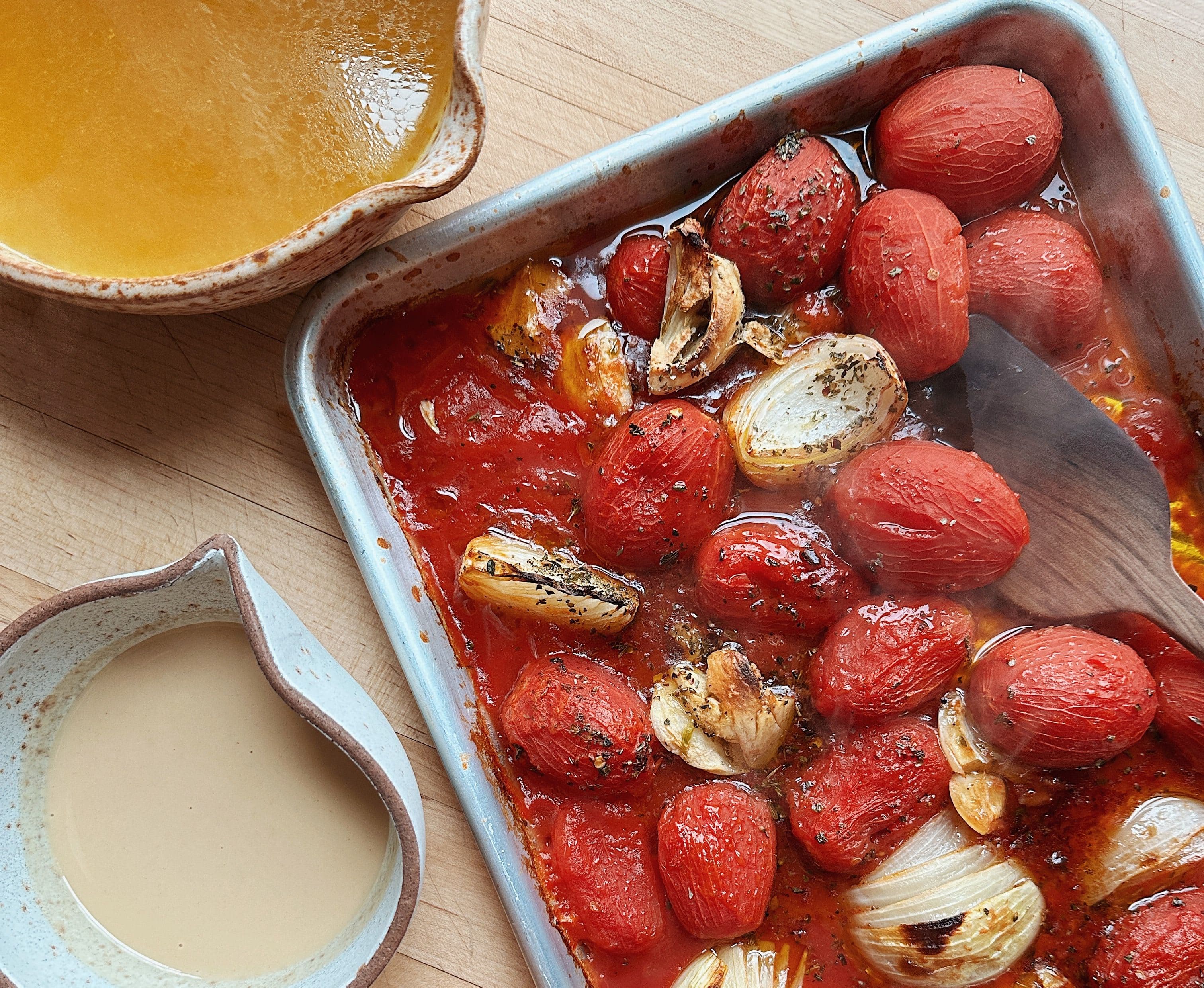 On a baking sheet with raised edges, combine the whole tomatoes, roughly chopped onion, garlic, dried oregano, chili flakes (if using), and olive oil. Toss to coat, then roast for about 25 minutes or until the onions are nicely browned and the tomatoes are beautifully caramelized.