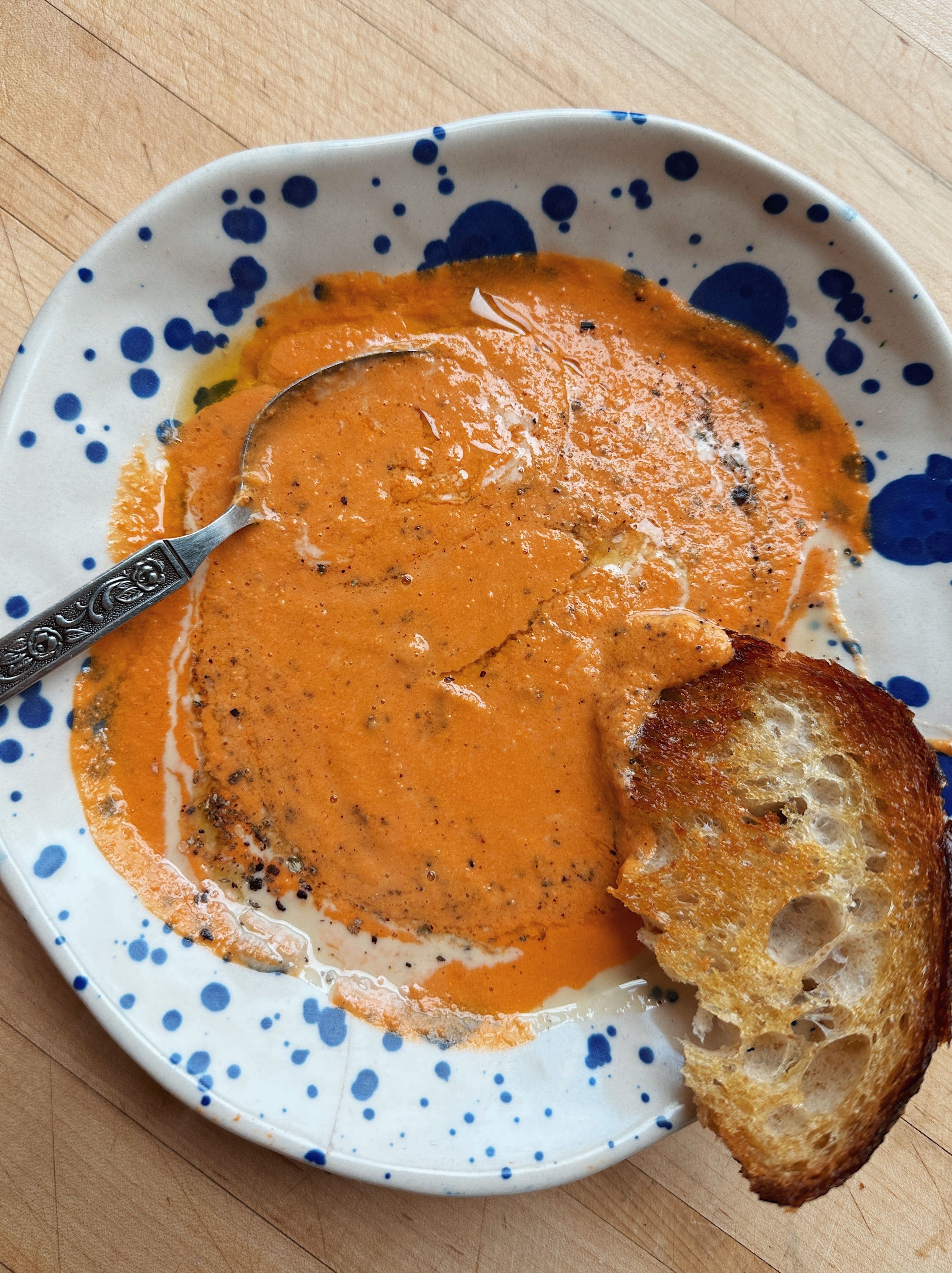 Pour the blended soup into a pot and gently simmer on low heat until it's warmed through. Taste and adjust seasoning as needed. Depending on the tomatoes you use, you may want to add a bit more salt, and a touch of sugar if desired.
