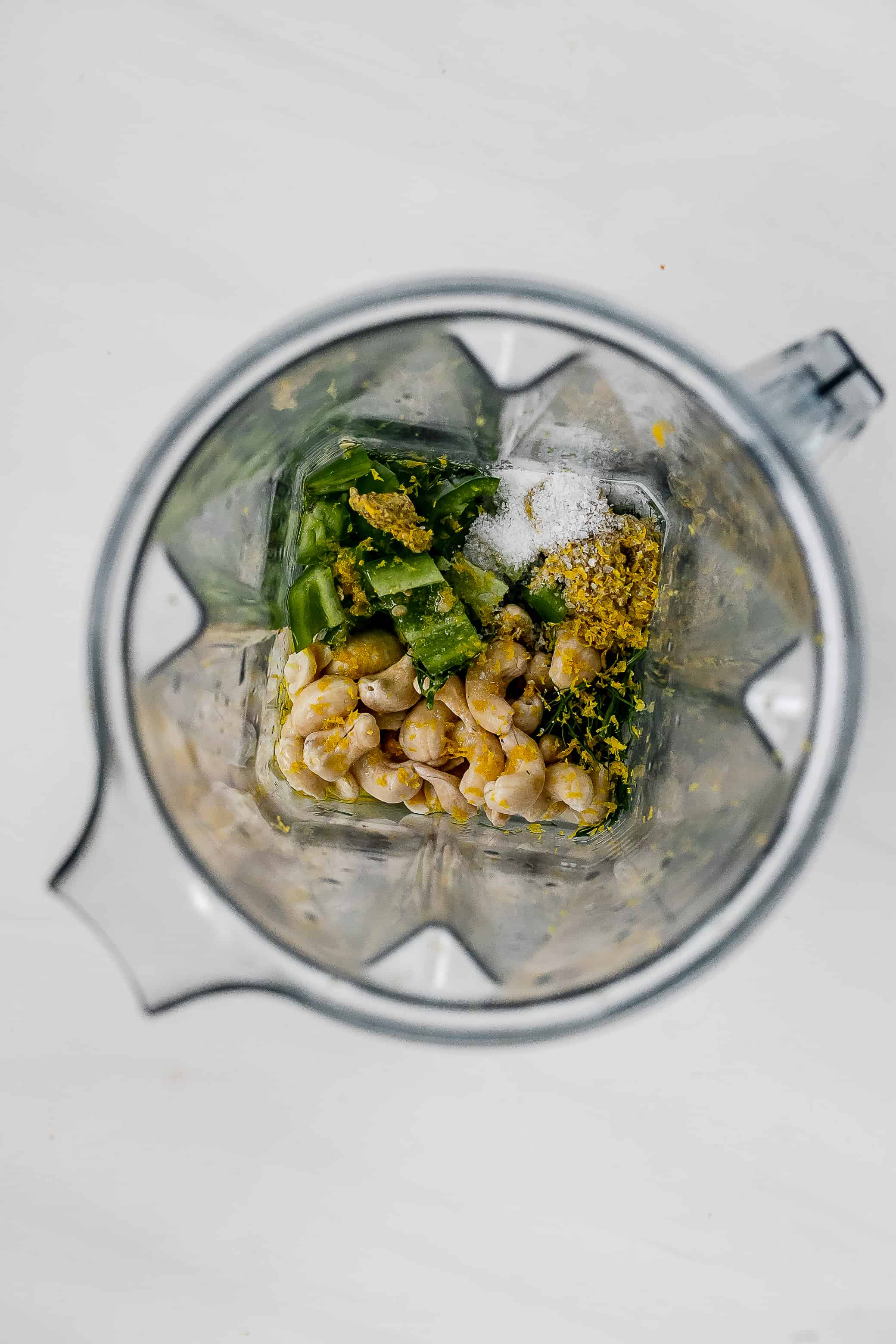 Pour the cashews into a high- powered blender along with the water, oil, mustard, sugar, lemon juice and zest, dill, jalapeño and salt. Blend until smooth and creamy. Add 1 tsp more water at a time if needed to thin.