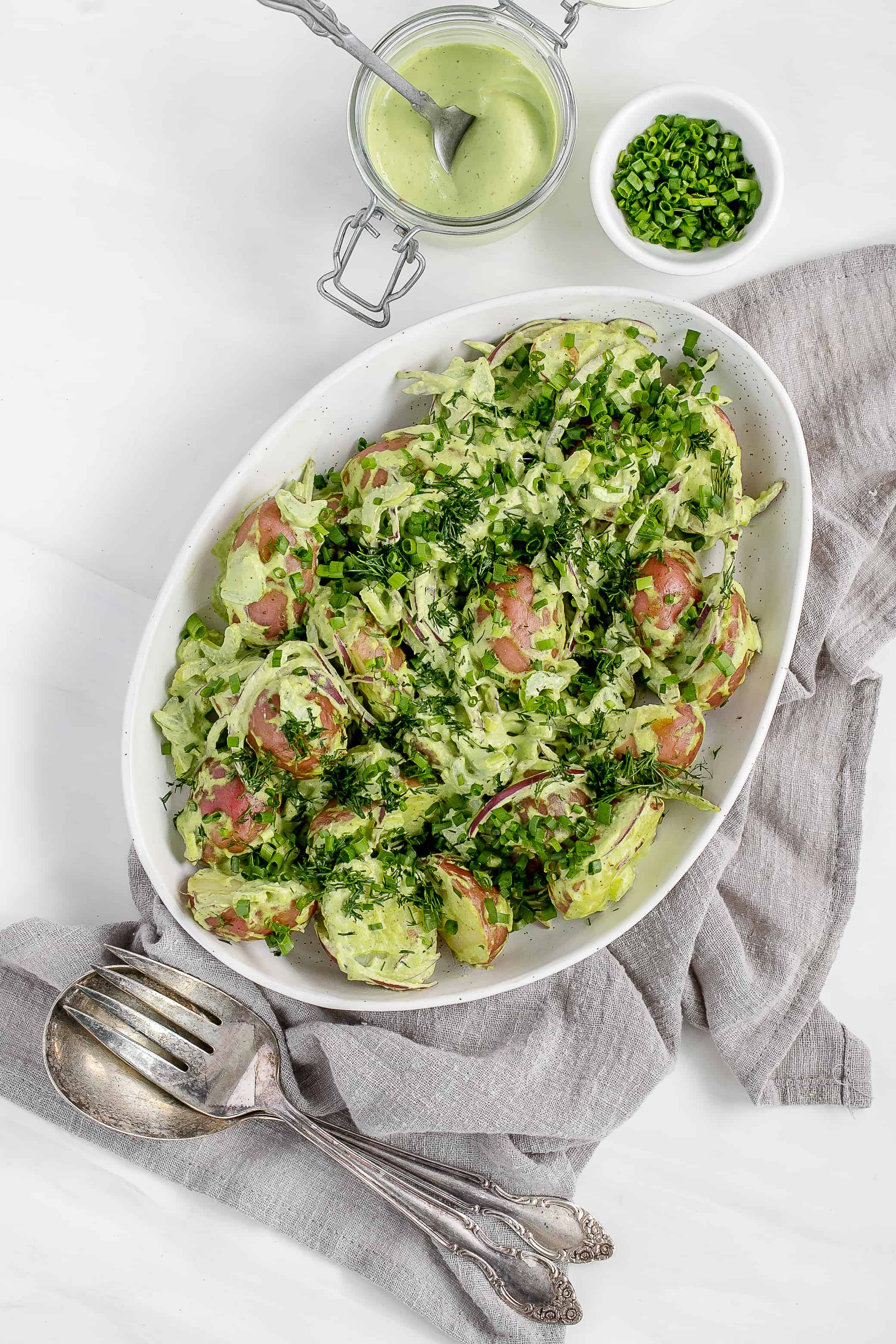 Place the potatoes in a large bowl and add the onion and celery. Pour the dressing over top and toss gently to combine. Garnish with extra dill and chives and season with salt and pepper to taste. Enjoy!
