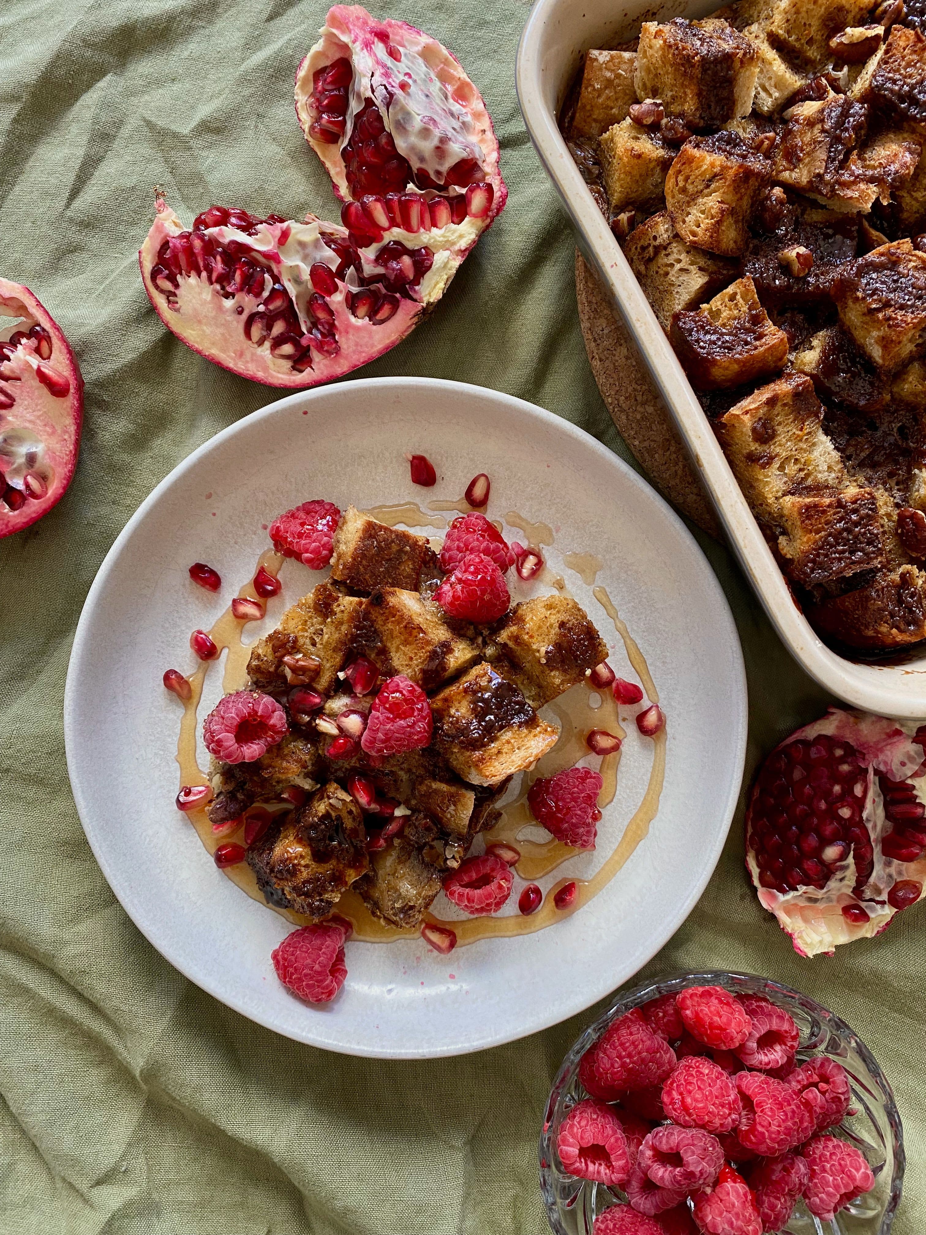 In a small bowl, whisk together the melted butter, 2 tablespoons coconut sugar, 1 teaspoon cinnamon and 1/8 teaspoon kosher salt. Drizzle over the French toast. Place in the oven and bake for 30-40 minutes until golden brown and cooked through. Allow to cool for 10 minutes before serving.