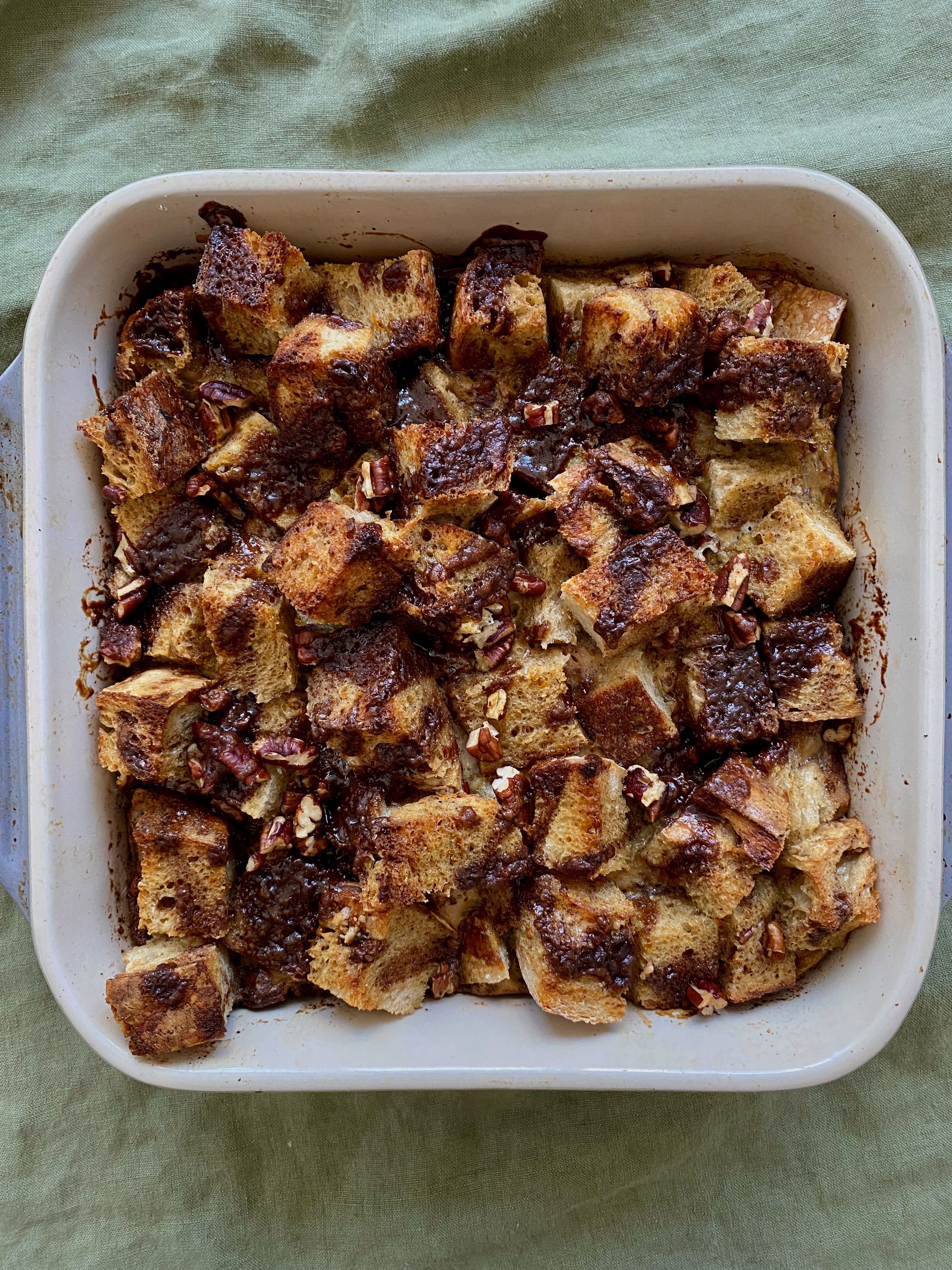 Preheat oven to 375℉ and lightly grease a square baking pan with butter. Add the sourdough bread to the pan along with the pecans and toss.