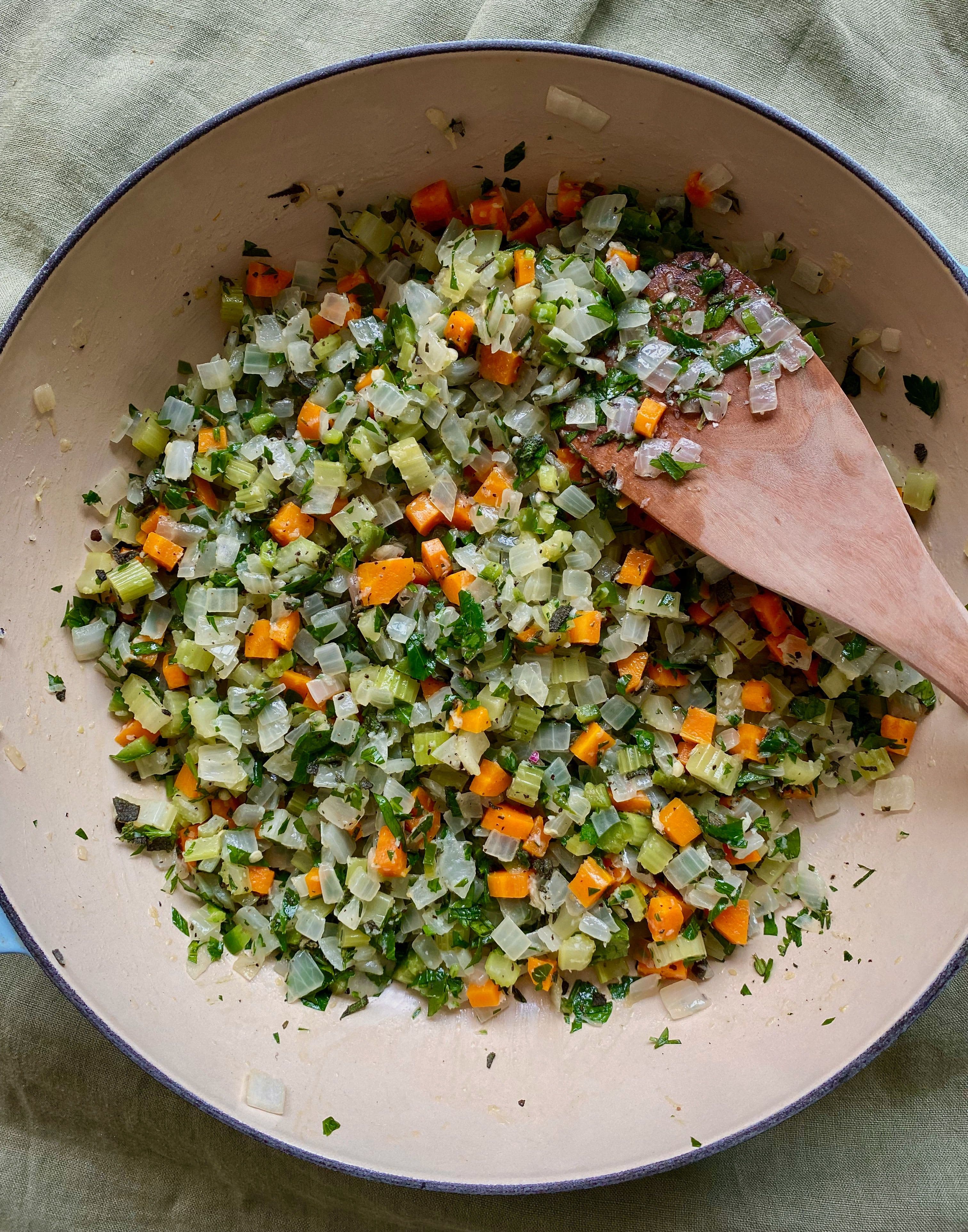 In a large skillet over medium heat, melt the 1/4 cup butter. Add in the onion and cook for 5 minutes until softened. Add the celery and carrots and cook for another 5-7 minutes until softened. Add the garlic and jalapeño and cook for 1 more minute. Add the sage and thyme and season with salt and pepper. Remove from heat.