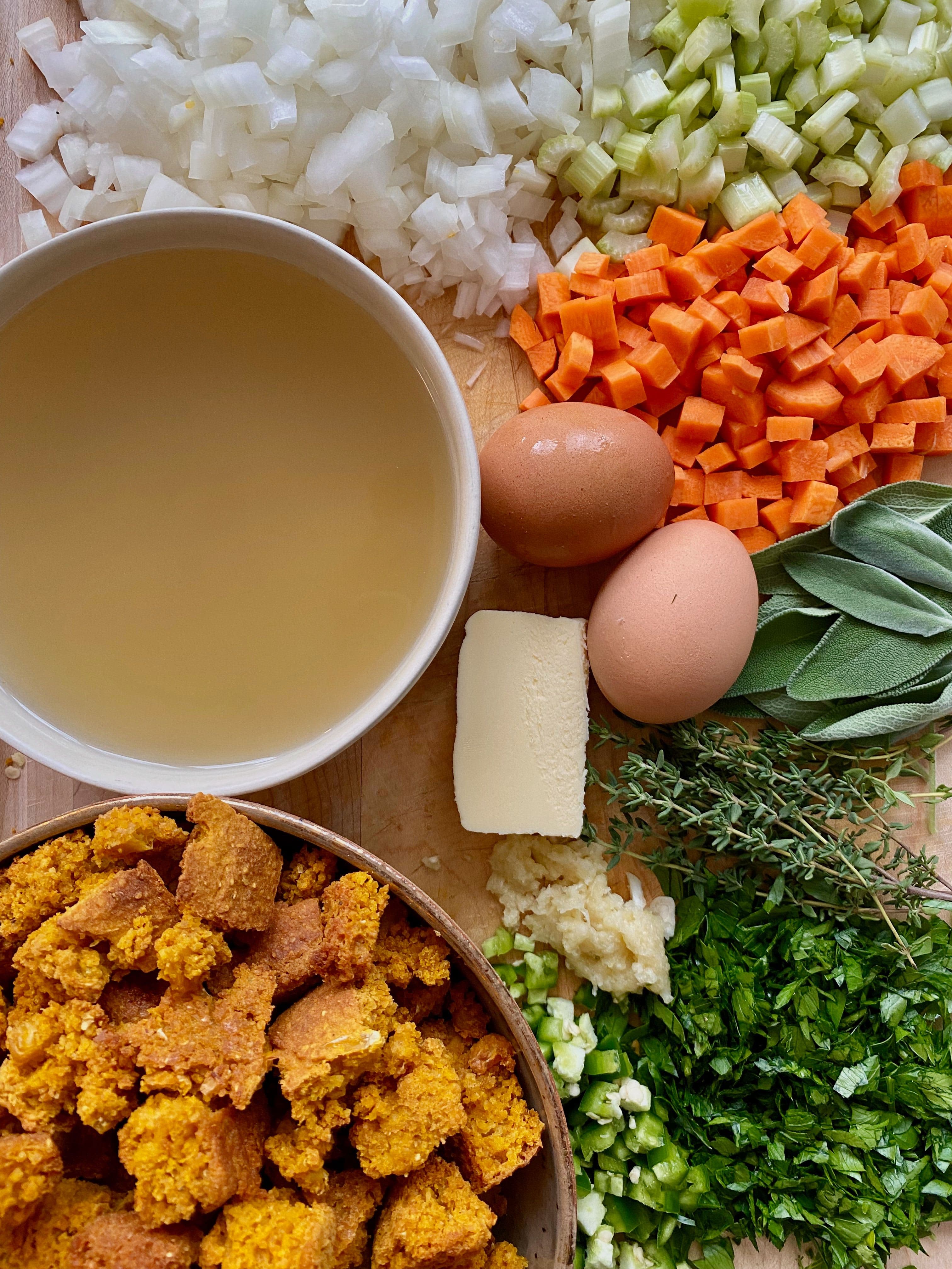 In a bowl, whisk together the eggs and broth. In a large bowl, combine the cornbread, vegetable mixture and parsley, then pour the broth mixture over top and very gently stir to combine. Allow the cornbread to absorb all the liquid. Season again with salt and pepper.