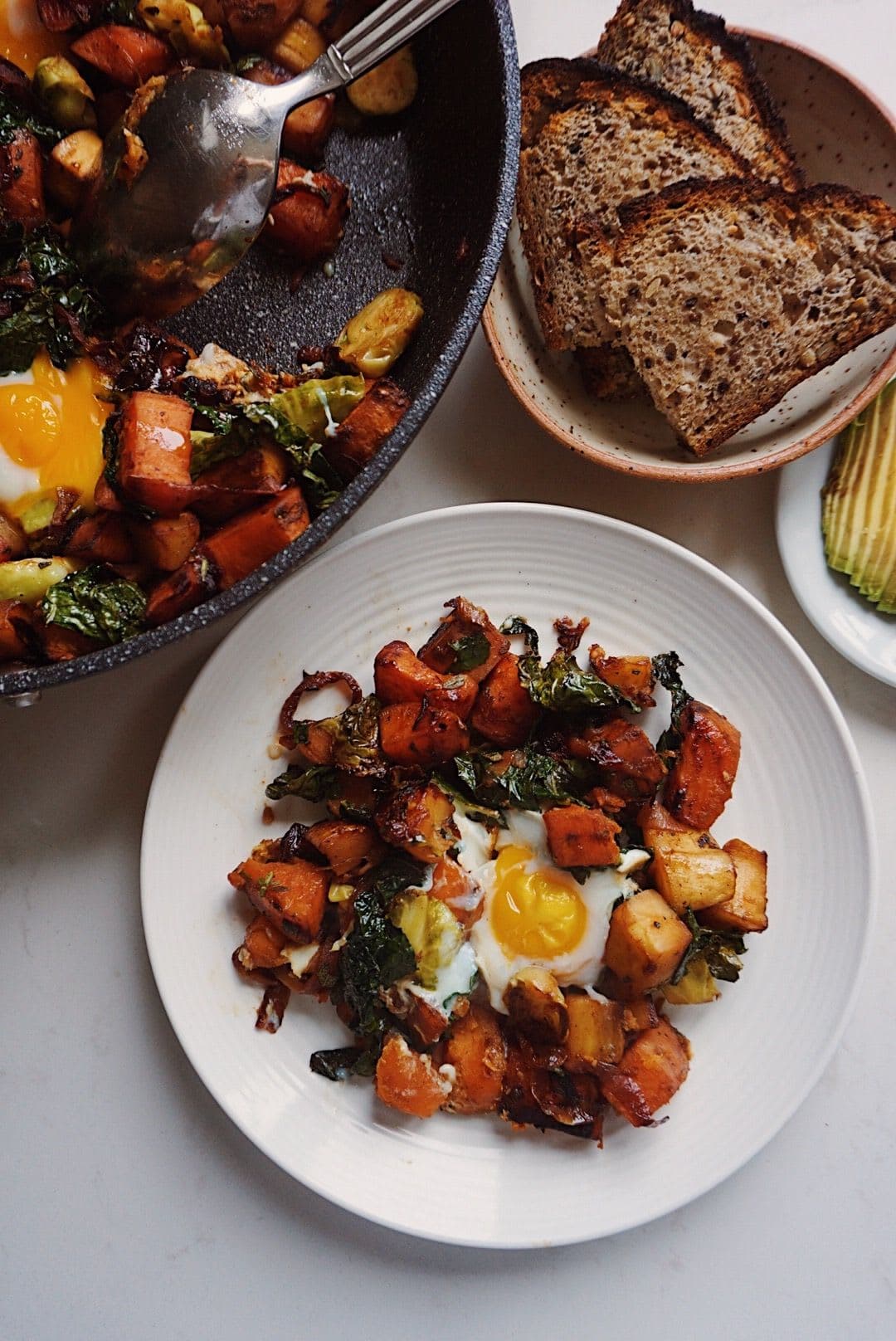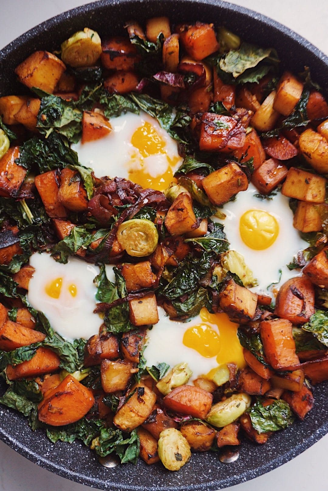 Make 4-6 little wells in the vegetable mixture, and crack an egg in each one. Cook for a few minutes until eggs begin to set, then transfer to the oven until desired egg consistency is reached about 5-8 minutes.