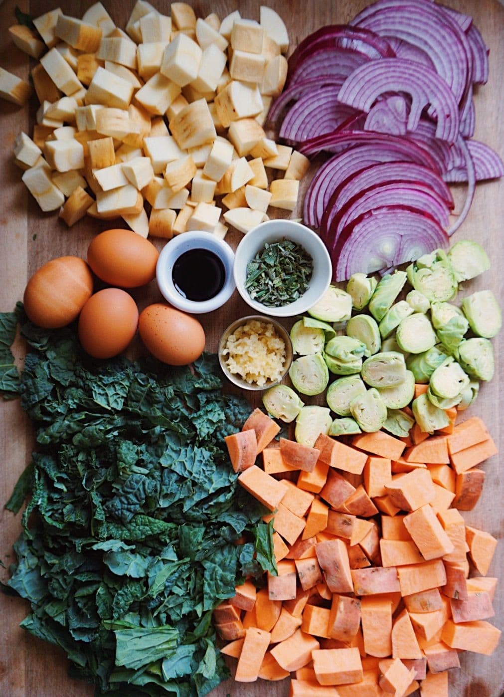 Substitutions: No Kale, use any dark leafy green, like chard or collard. No parsnips, use carrots or turnips. No sweet potatoes, use any variety of potatoes.