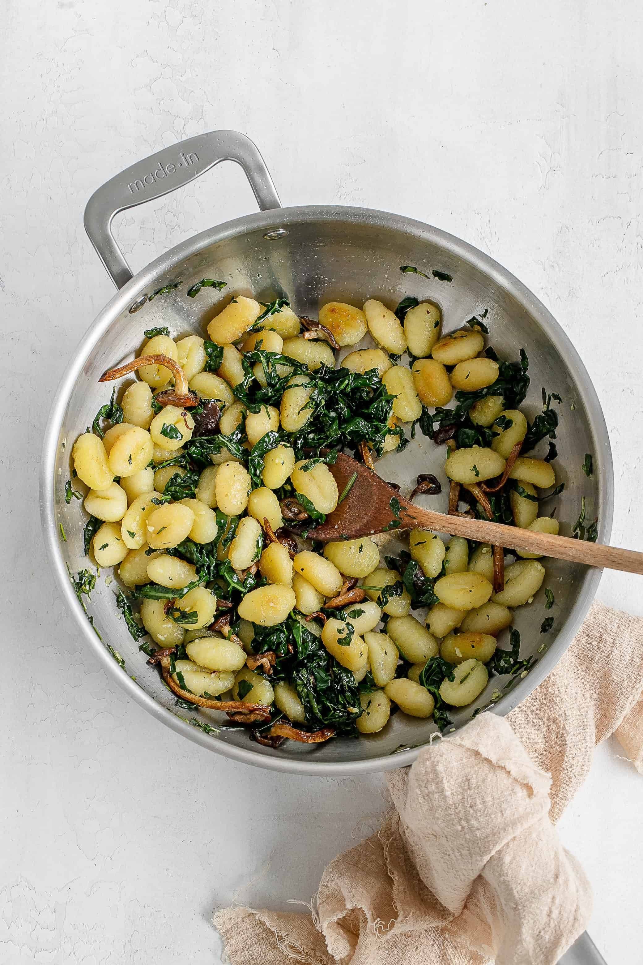 Pour in the gnocchi and let them sit undisturbed in an even layer for about five to six minutes, until slightly browned and crispy. Drizzle with more olive oil to prevent sticking. Toss and cook for another three to four minutes, until softened.