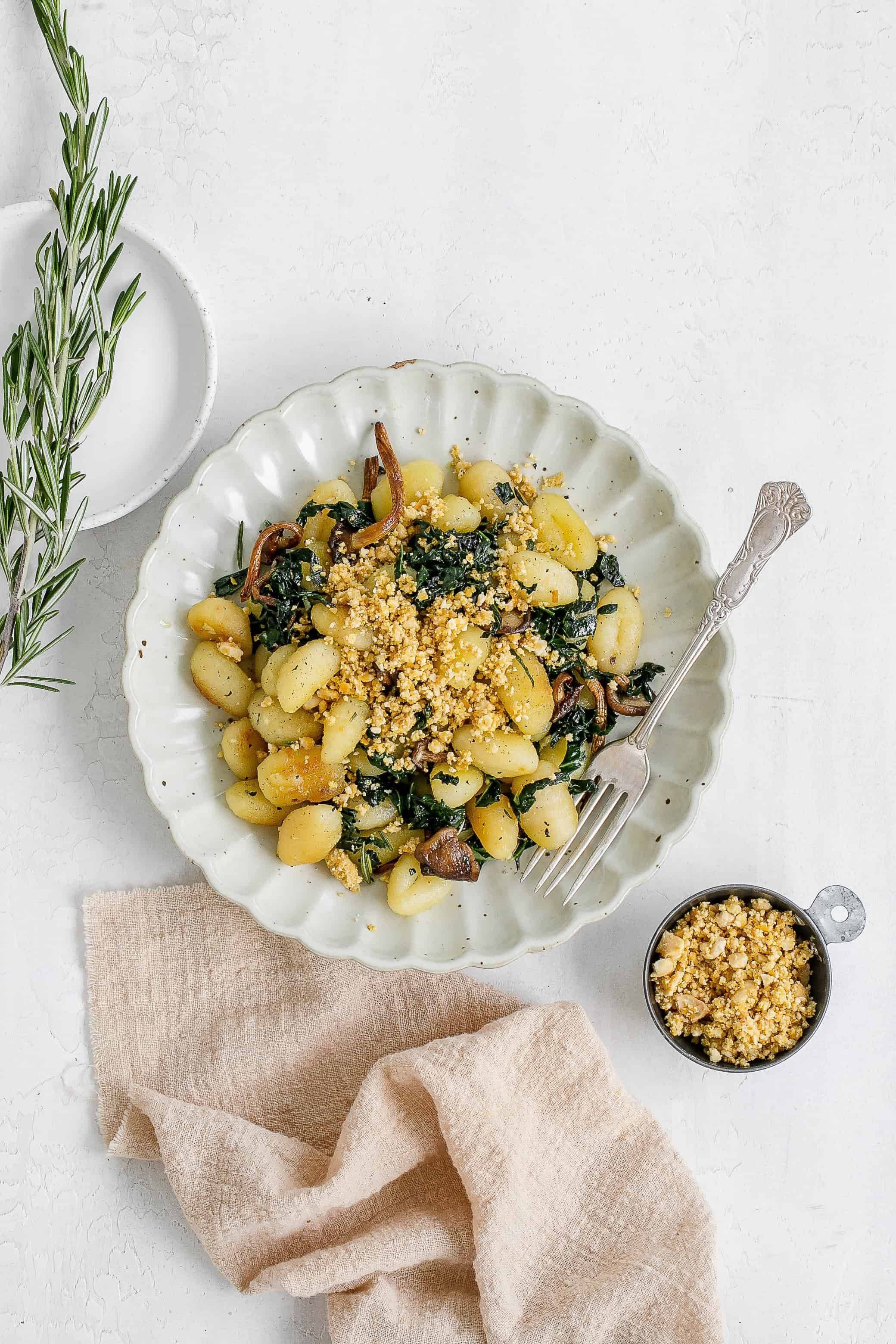 If you need a quick and easy dinner idea for during the week, this pan fried gnocchi recipe is perfect for that. The shelf stable packages of gnocchi don’t actually need to be boiled, and they taste delicious when crisped in a skillet. Toss in your favourite mushrooms, kale and garlic and you’re all set.