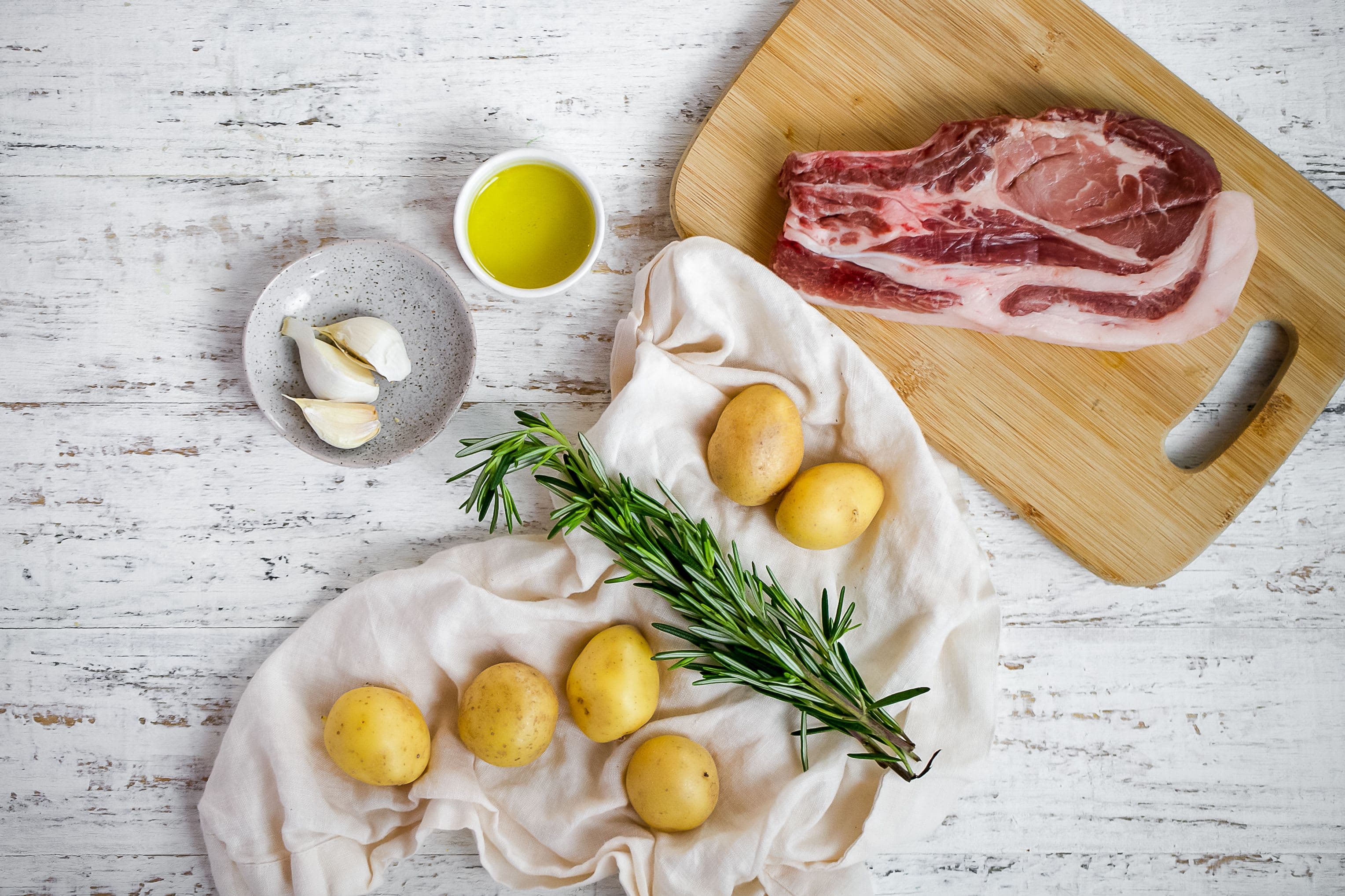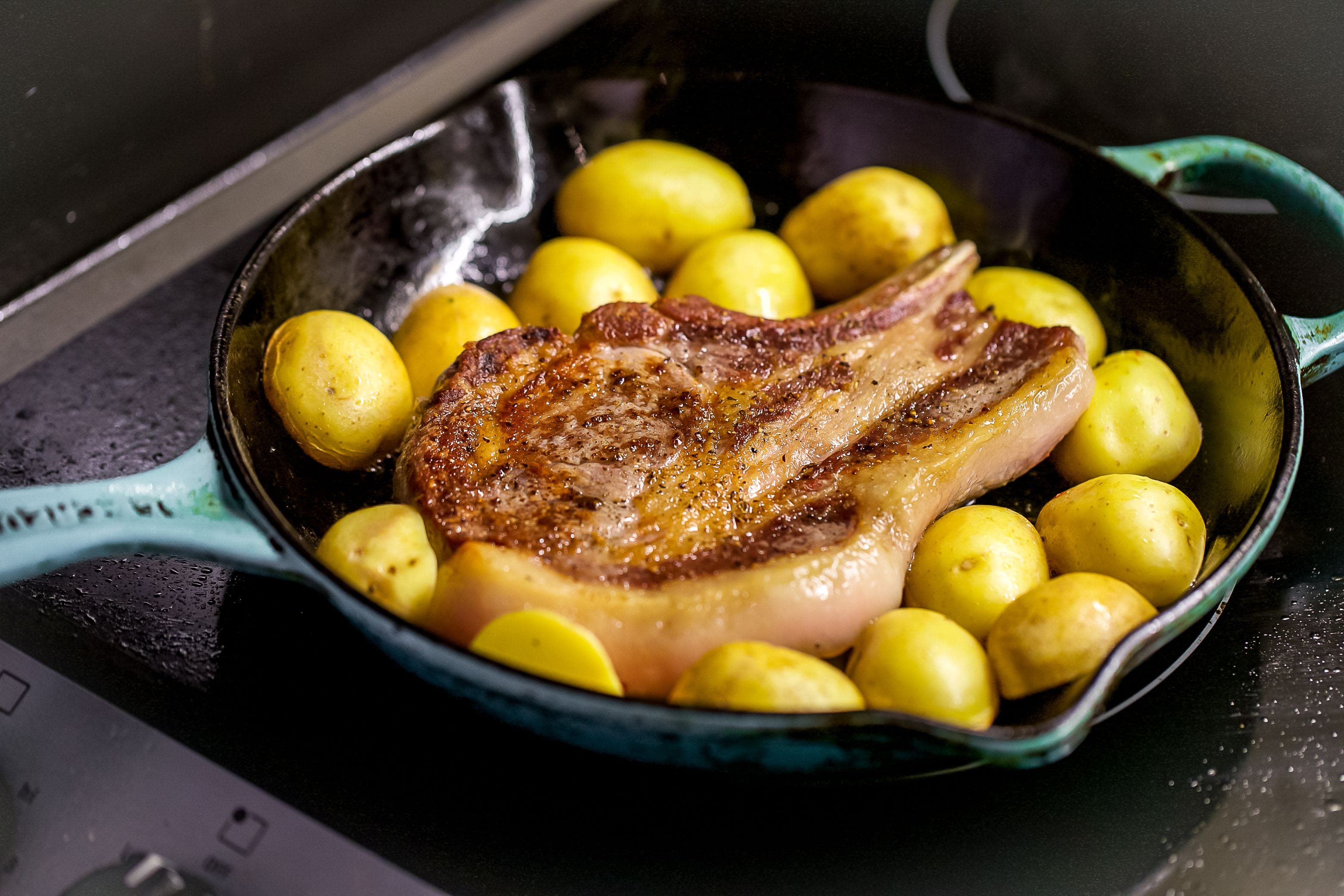 Heat a large cast iron skillet over medium-high heat and add the avocado oil. Add the pork rib chop and let it sear until a deep golden brown crust forms, about five to seven minutes. Add the halved potatoes, cut side down, and season with the remaining salt. Flip the pork and let it cook for an additional four to five minutes, until browned and cooked through to medium. Remove the pork and set aside.