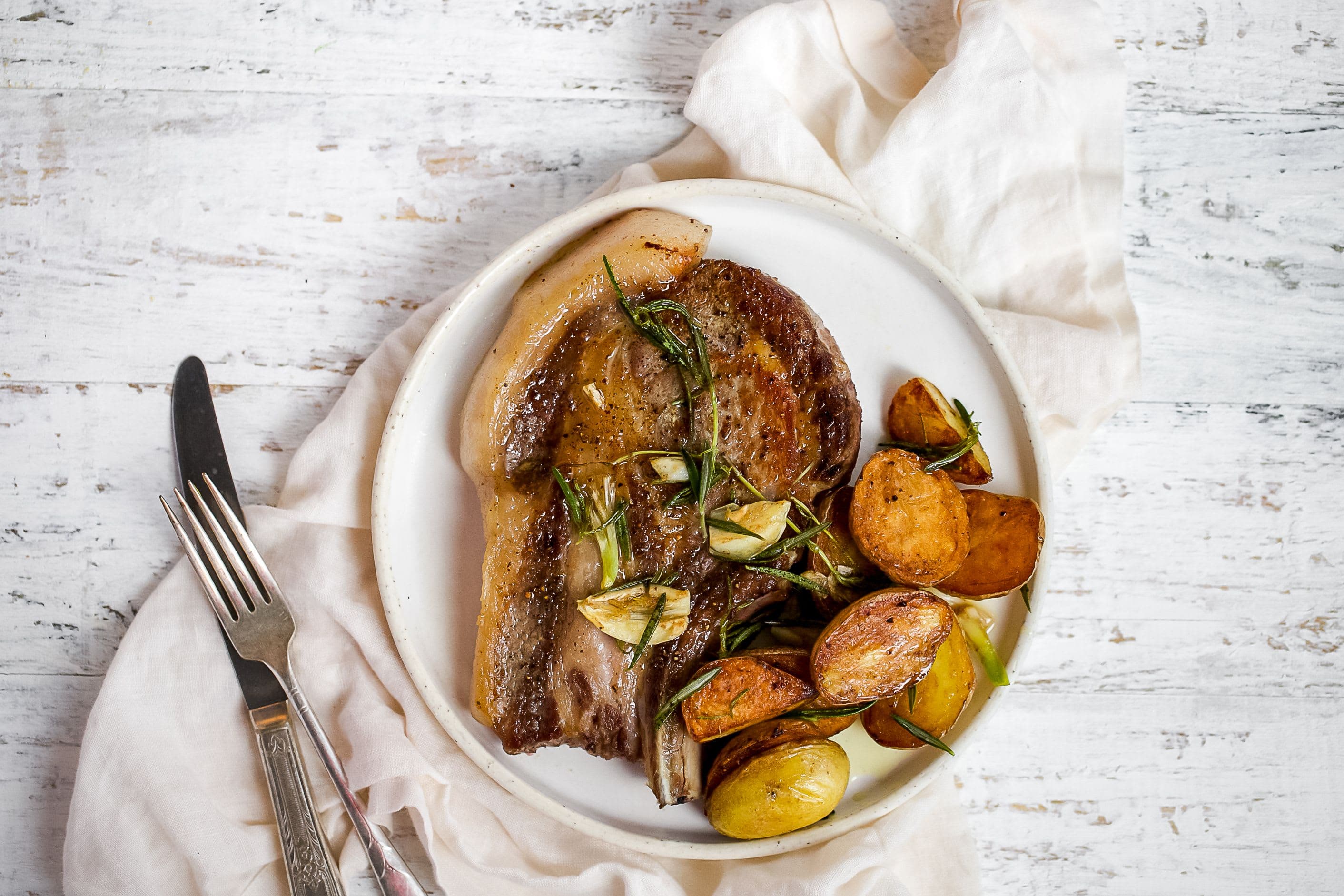 Cast iron crispy pork rib chops served with halved baby potatoes for a quick and easy weeknight meal. Serve alongside a salad for a complete meal! This is great for diabetes, low sugar, gluten-free, dairy-free and nut-free diets.