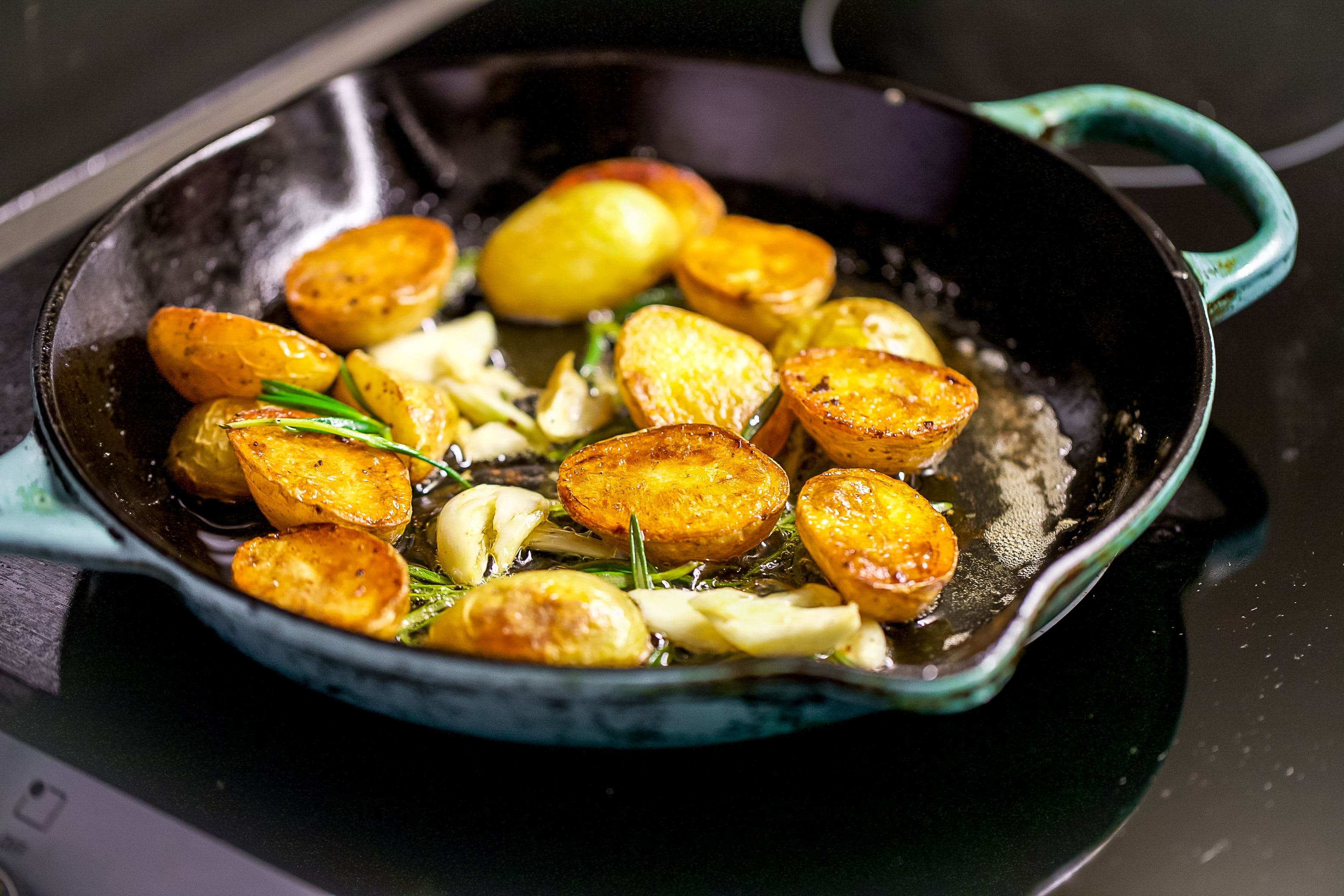 Turn the heat down to low and add the garlic and rosemary to the skillet with the potatoes and toss to combine. Cook for three to four minutes, until the garlic is fragrant.