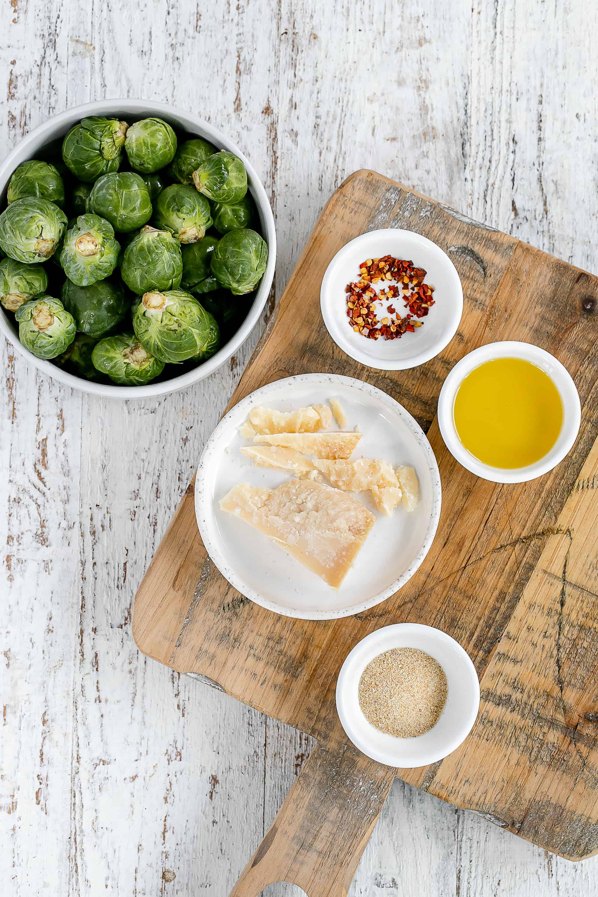 Remove the sprouts from the oven and flip them over. Top with the garlic powder, parmesan cheese and chili flakes. Place back in the oven and bake for another six to eight minutes.