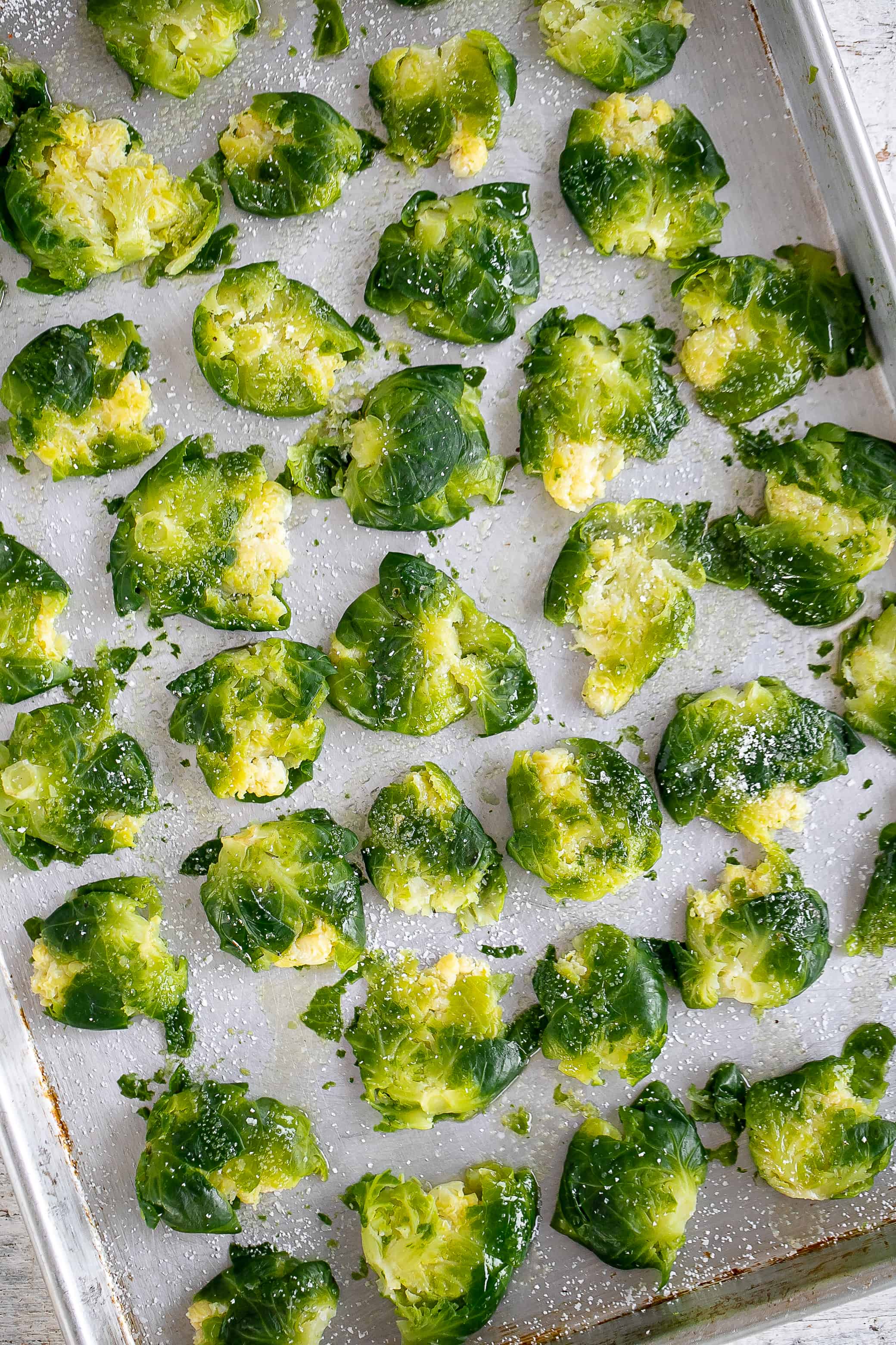 Drizzle a large sheet pan with some oil. Add the sprouts to the pan and smash using the bottom of a glass or mug, pressing down with both hands. Repeat with the remaining sprouts.