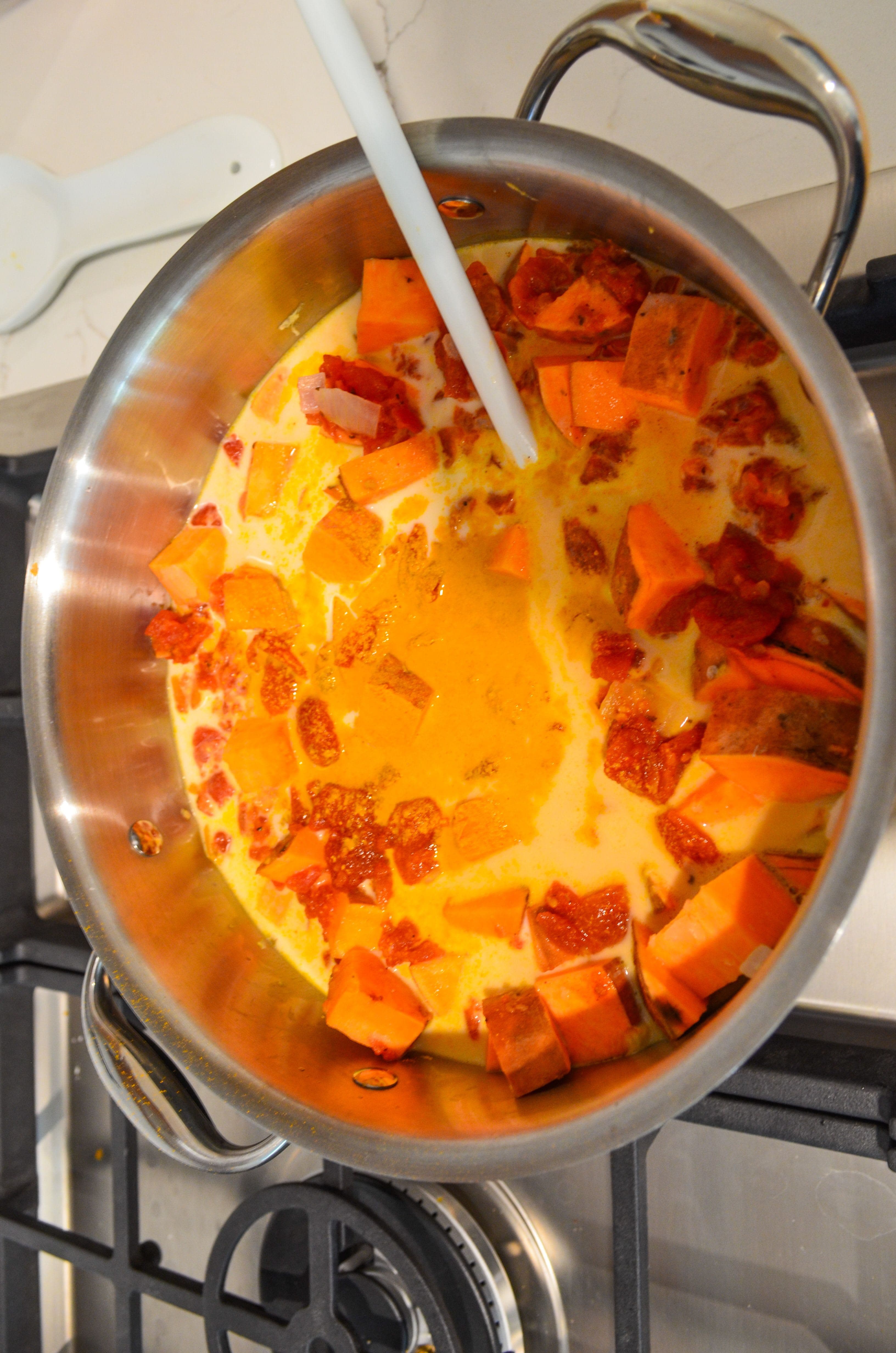 Add tomatoes, coconut milk, broth, salt and turmeric. Cover and bring to a simmer. Simmer for 15-20 minutes, until sweet potatoes are fork-tender.