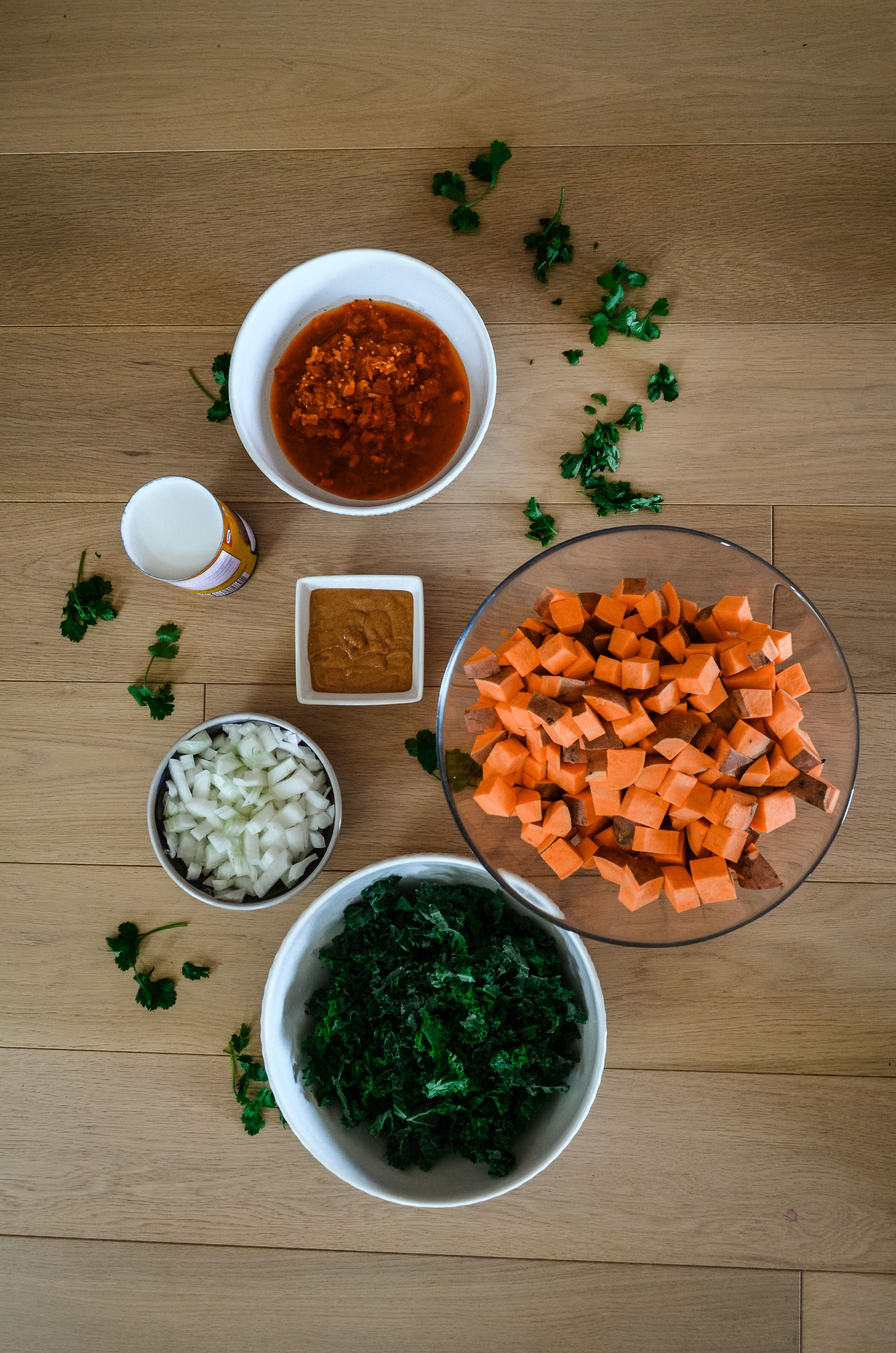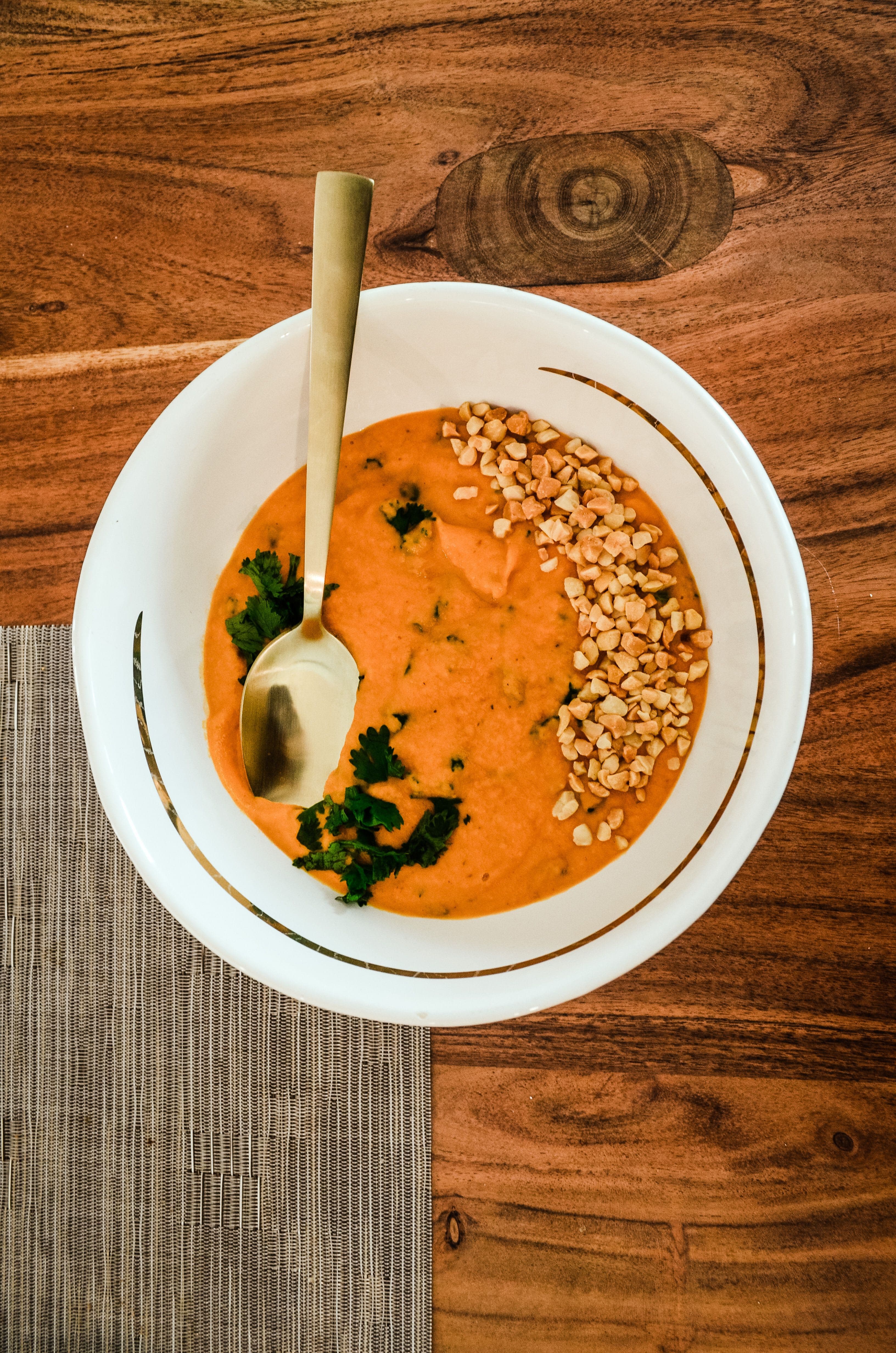 Add kale and simmer for another 2-3 minutes, until kale is wilted and soup is thick and creamy. Serve and enjoy, topping with crushed peanuts and cilantro!