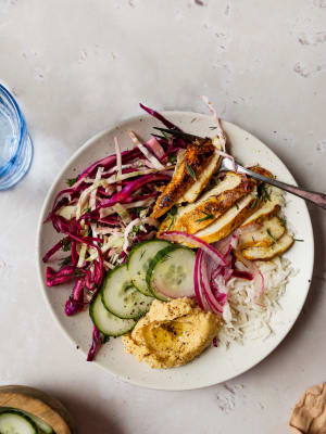 To assemble the bowls: layer your base of rice, then add coleslaw, hummus, add sliced chicken, pickled onions, pickles, and coleslaw.