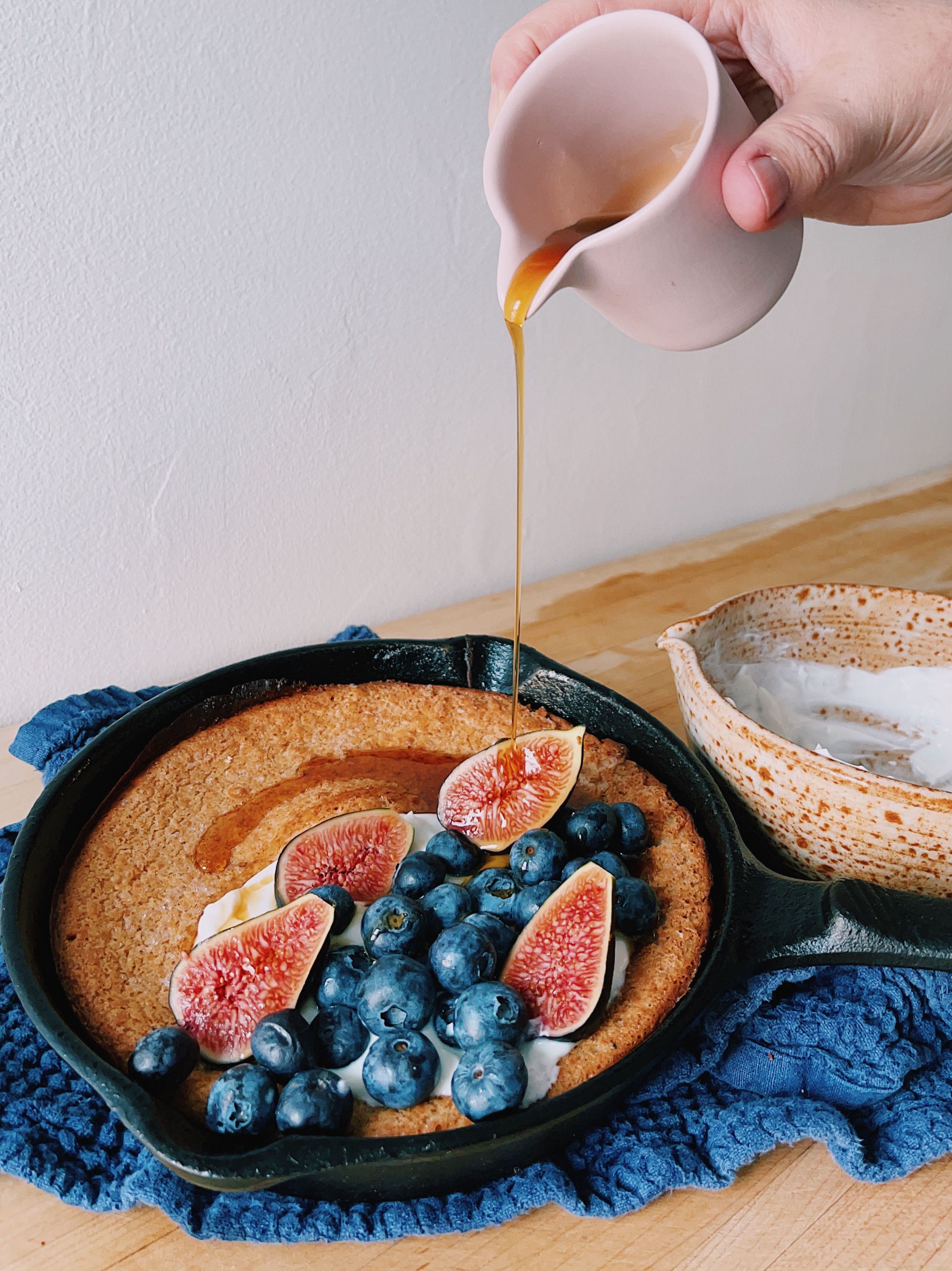 Remove the Dutch Baby from the oven and top with the whipped yogurt and maple syrup. Enjoy!