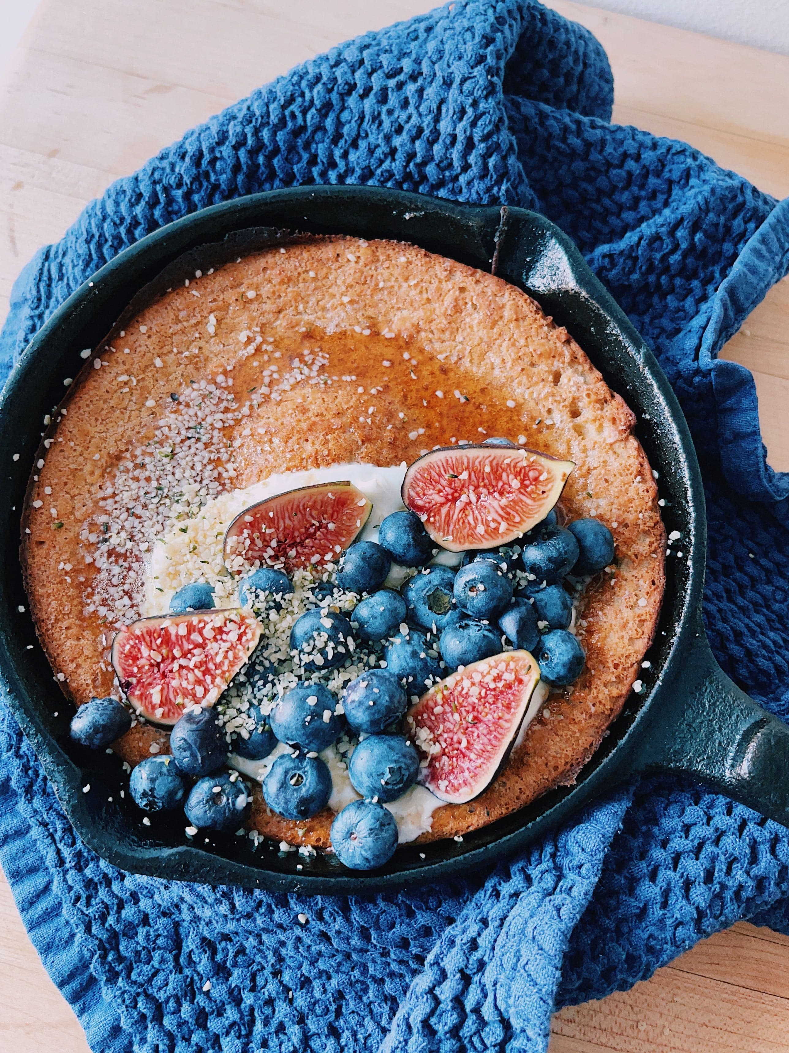This perfectly fluffy pancake is a great option for a family brunch table. A dutch baby is traditionally a fluffy and satisfying pancake served family style with lemon and icing sugar. It’s a show stopper that comes together quickly and is so delicious. Loaded with protein, healthy fats and fiber to keep you feeling satisfied throughout the day.